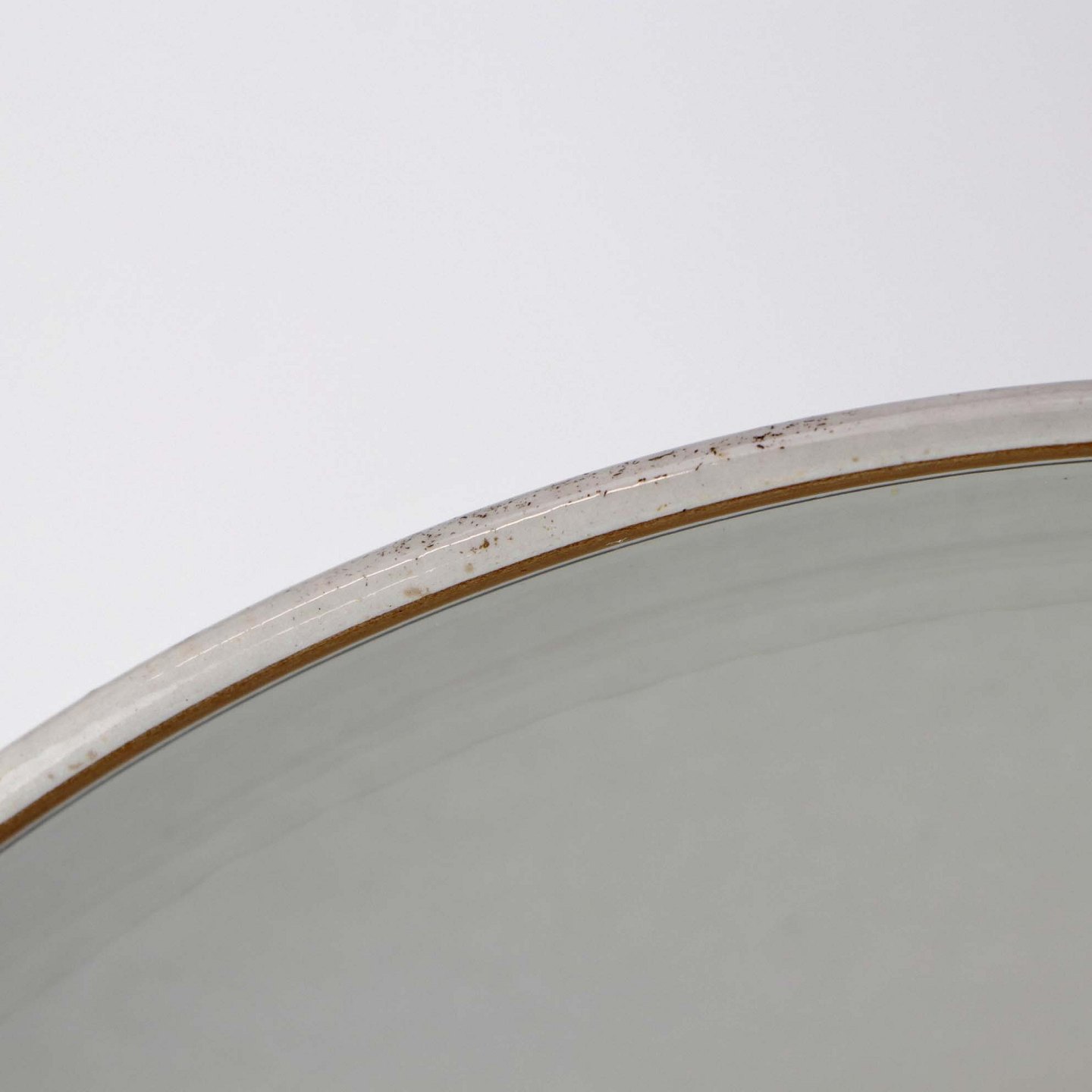Fremstår med tre mindre misfavninger under glasuren, sorte nister og ujævnhed i glasuren.