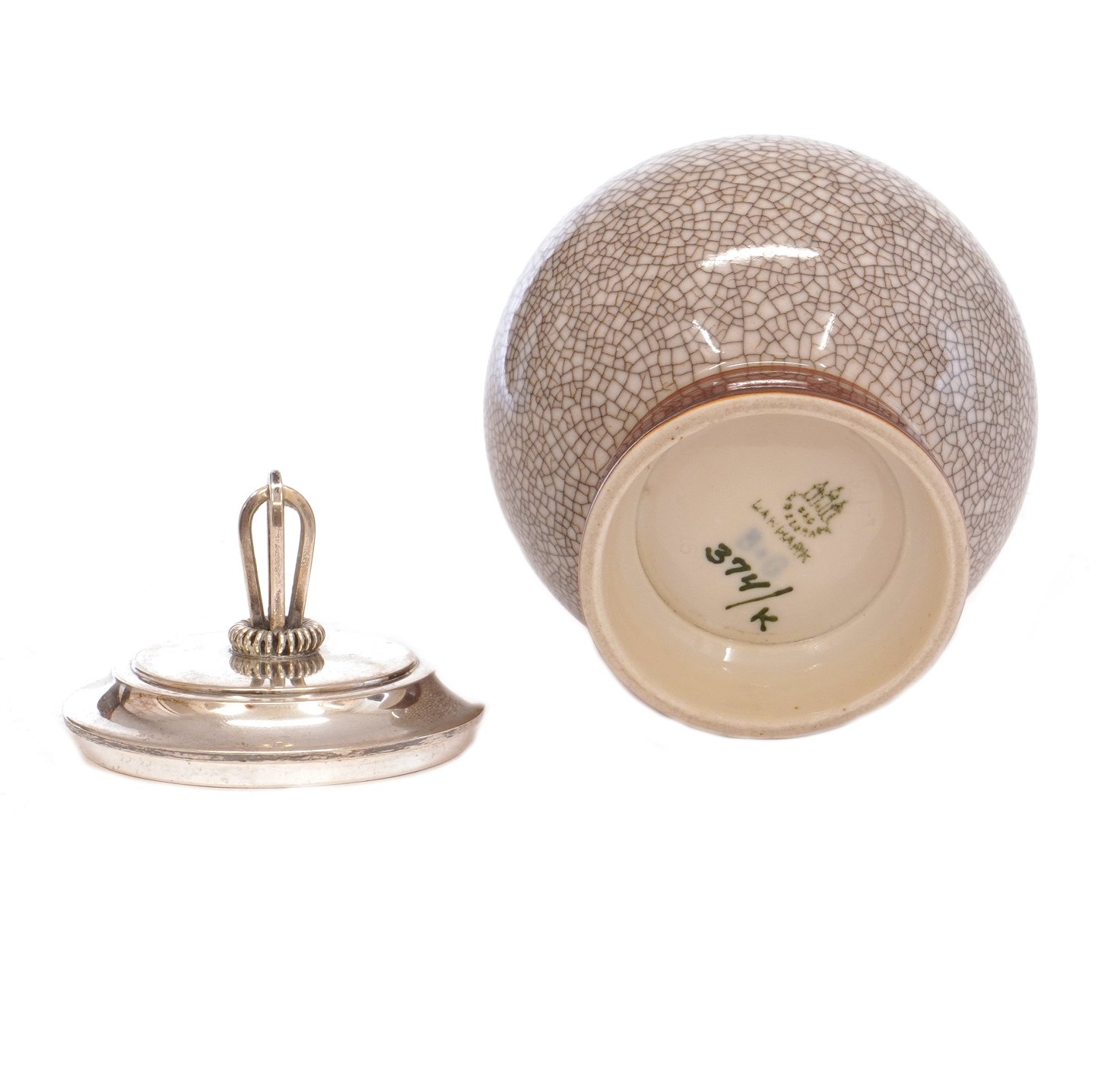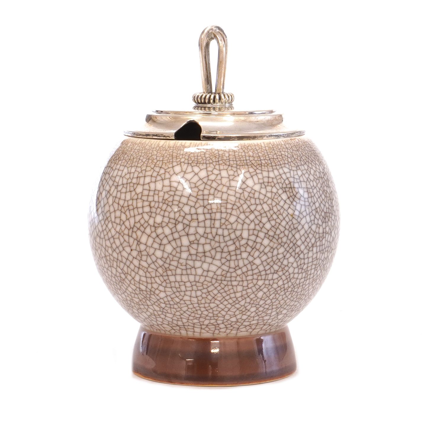 B&G marmeladekrukke i krakelé med sølvlåg af Hugo Grün, København, 1949. H: 13cm