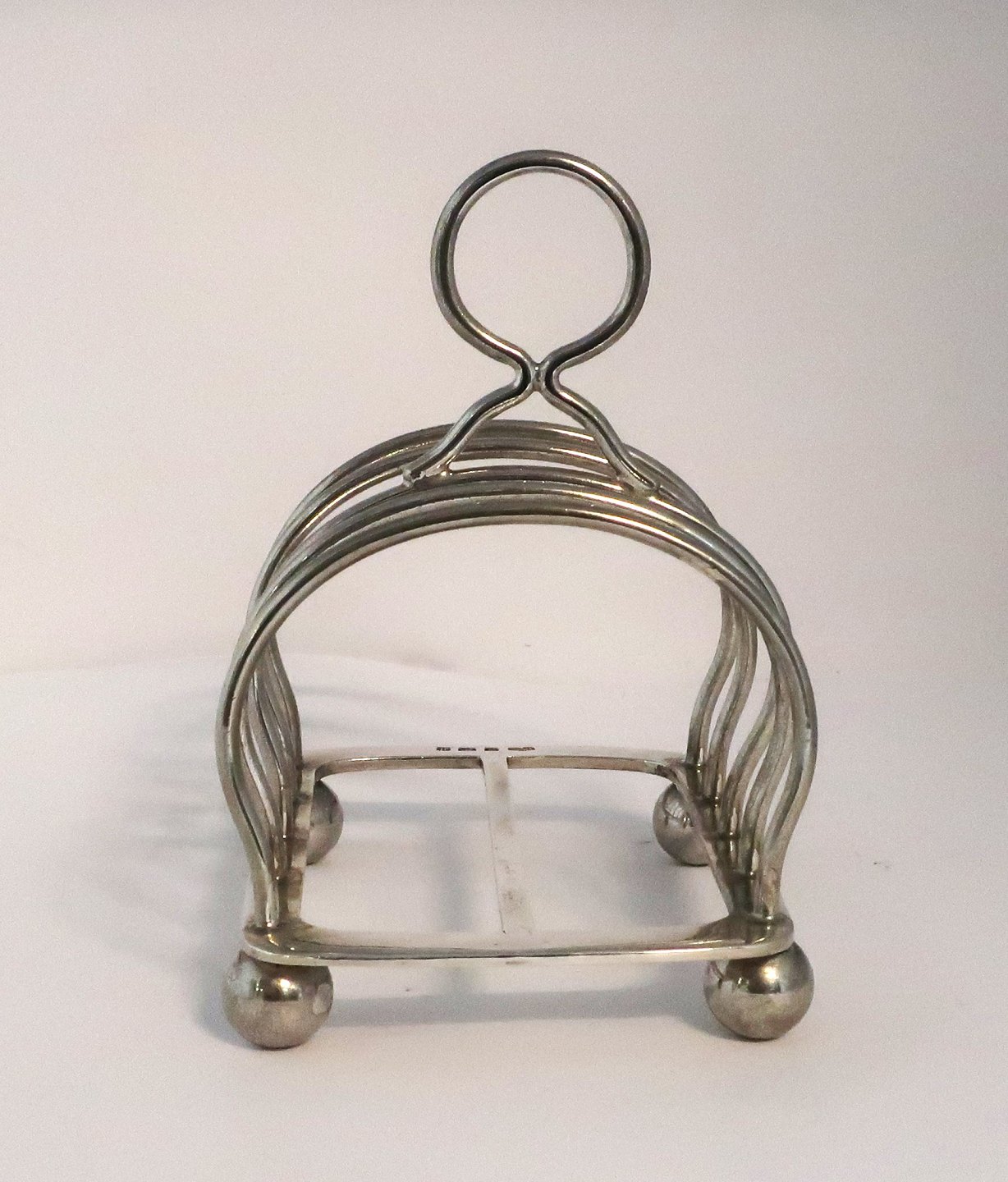 Beskrivelse: Elkington. Engelsk toastholder i sterling sølv (925). Længde 12 cm. Højde 13,5 cm. Produceret Birmingham 1907.