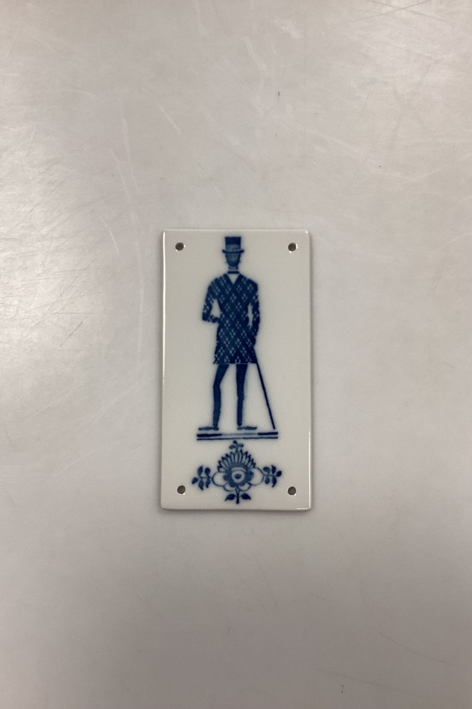 Beskrivelse: Royal Copenhagen Toiletskilt Herre No. 9875 H. Måler 11,8 cm x 6,4 cm / 4,64 in. x 2,52 in. 1. Sortering.