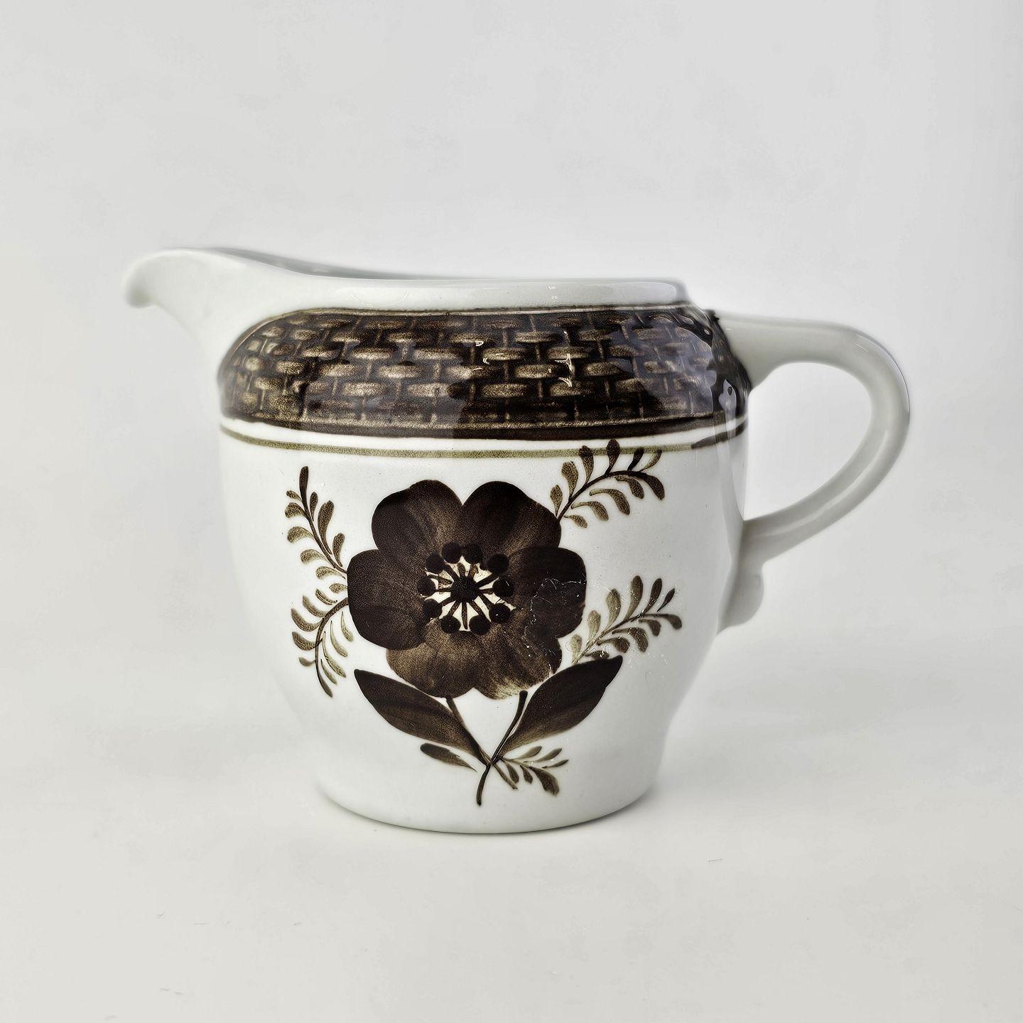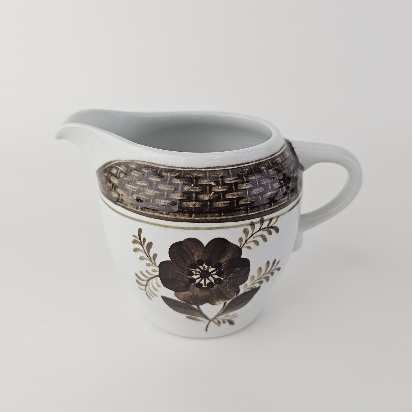 Fajancestellet med flettet kant og dekoration af brune blomster på lys baggrund med brun kant