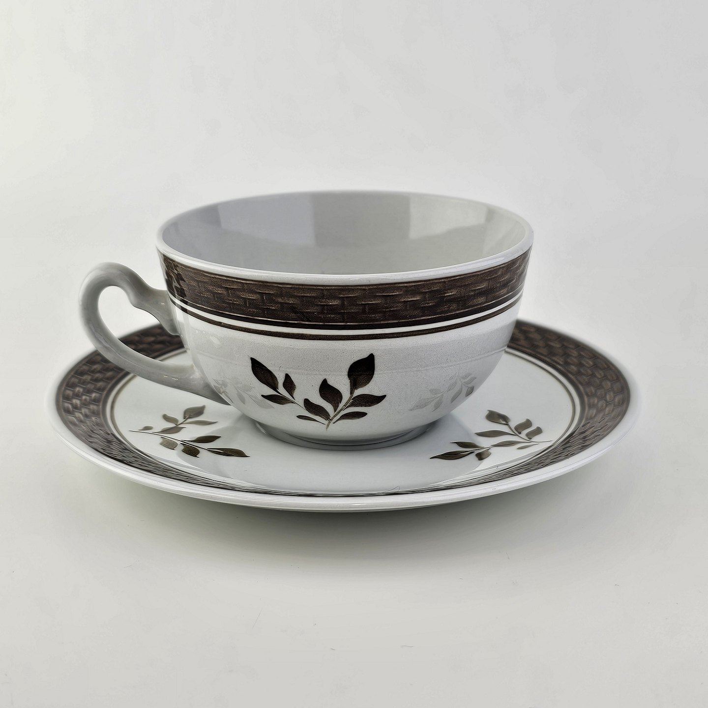 Fajancestellet med flettet kant og dekoration af brune blomster på lys baggrund med brun kant