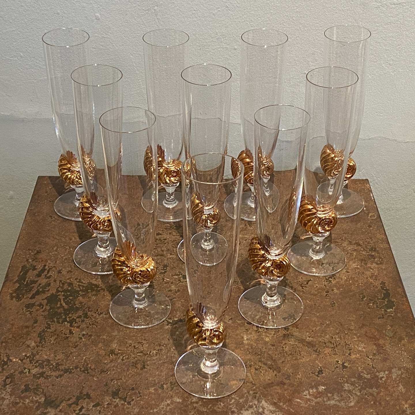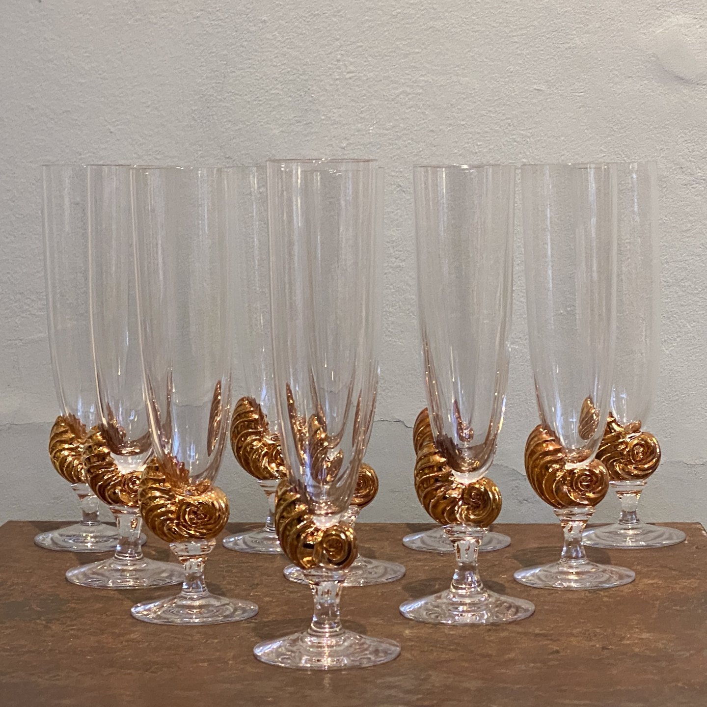 Designet af Darryle Hinz. Fremstillet af klart glas med en forgyldt dekorativ stilk i form af konkylie.