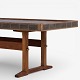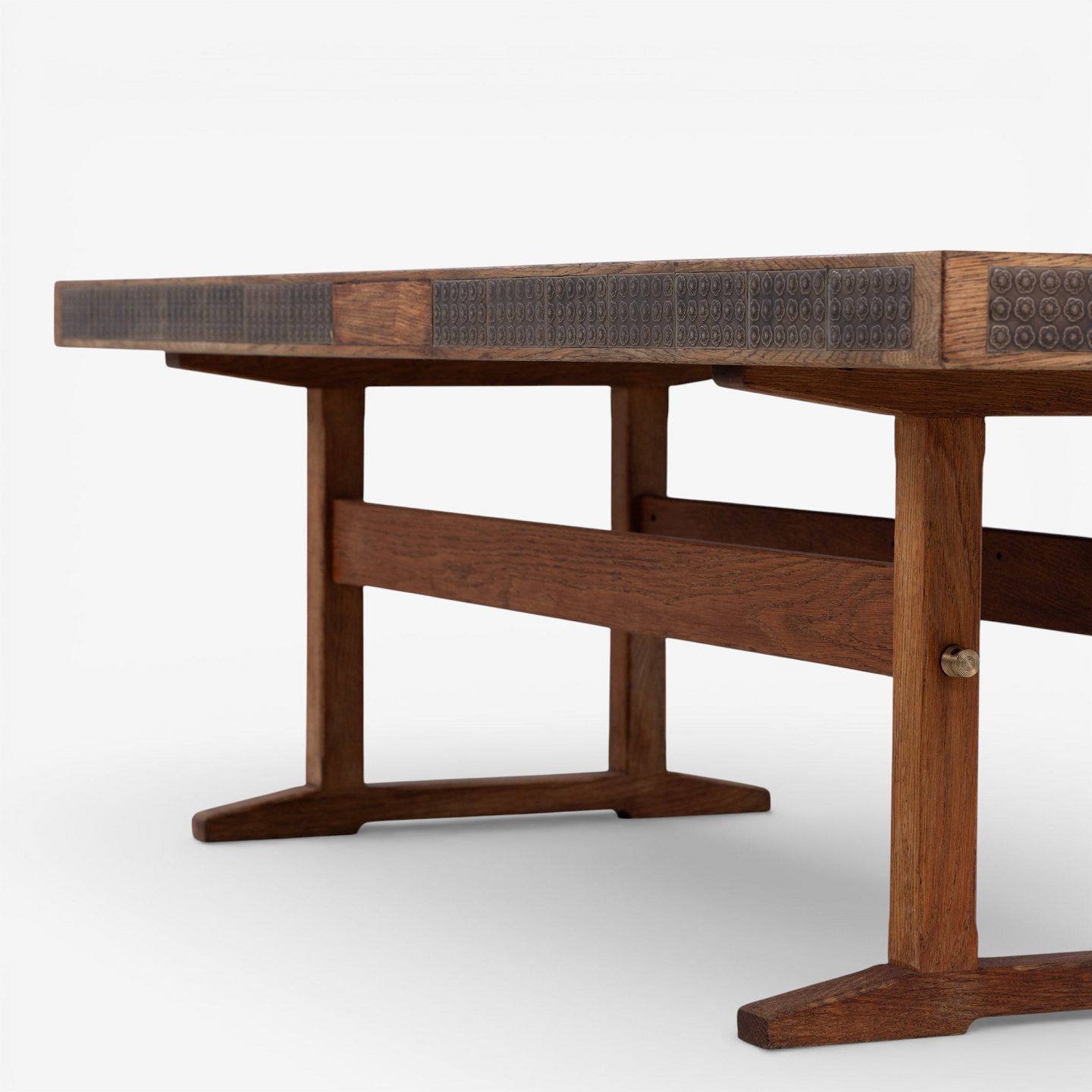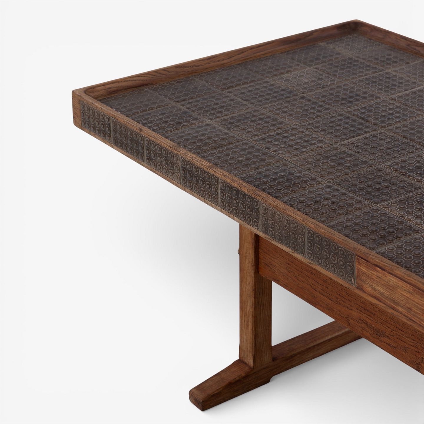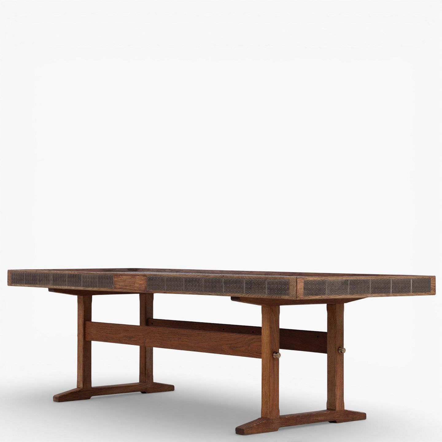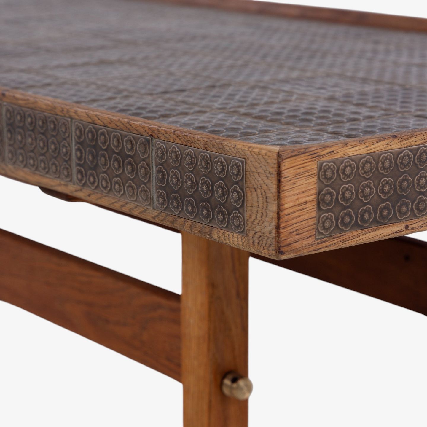 Coffee table in patinated oak decorated with brown tiles. Stamped by manufacturer.