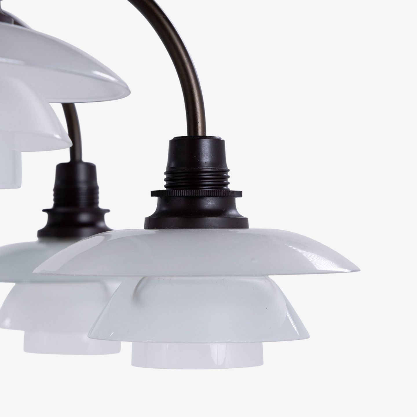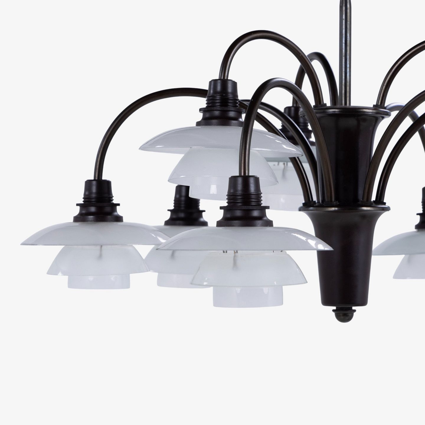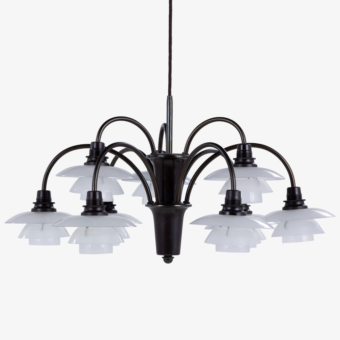 PH 1/1 - 'Bombardement'-lysekrone med 9 arme i bruneret messing og skærme i mat glas. Stemplet 'Patented'.