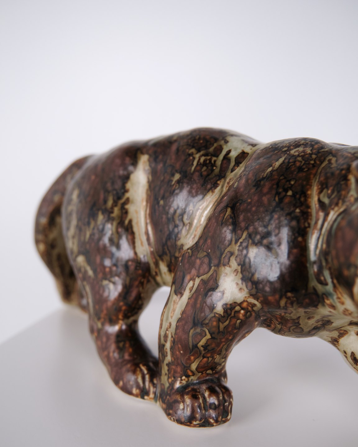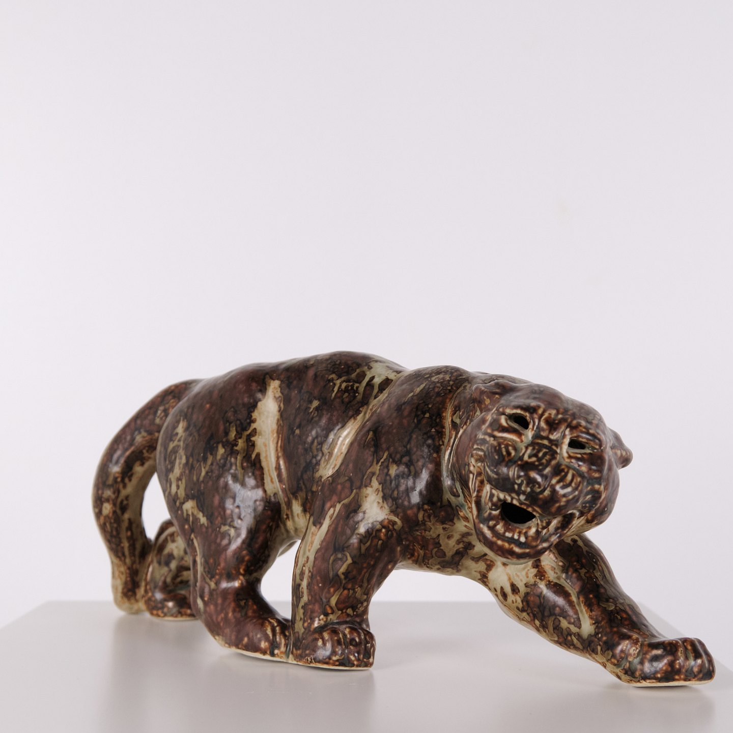 Description: Steinzeugfigur mit Panthermotiv, Modell 20283, entworfen von Knud Kyhn für Royal Copenhagen. Die Figur wurde aus Steinzeug gefertigt und gehört zu Knud Kyhns Tierdarstellungen, die bei Royal Copenhagen produziert wurden und dem dänischen Keramikdesign des 20. Jahrhunderts zuzuordnen sind.
