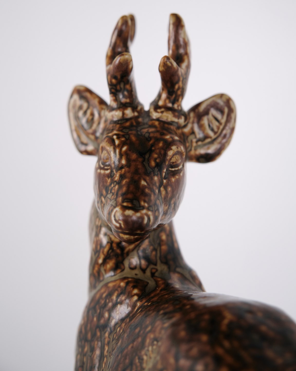 Beskrivelse: Stentøjsfigur med motiv af stående hjort, model nr. 21333, designet af Knud Kyhn for Royal Copenhagen. Figuren er udført i stentøj og indgår i Knud Kyhns serie af dyrefigurer produceret hos Royal Copenhagen i midten af det 20. århundrede. Modellen er kendetegnet ved en markant kropsform og tydelig bearbejdning af overfladen, som er gennemgående for Kyhns arbejde med naturmotiver.