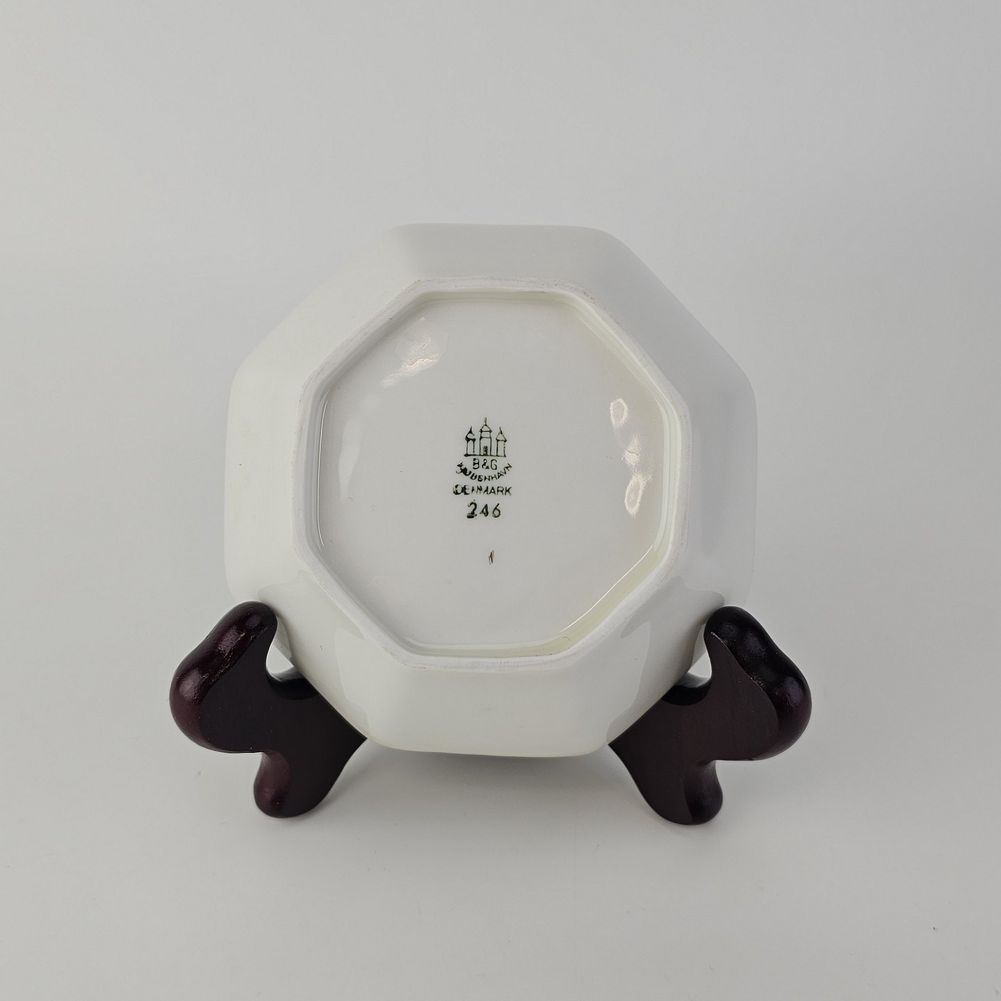 Frigga Anemone er cremefarvet porcelæn dekoreret med motiv af anemoner og bøgeløv med guldkant
