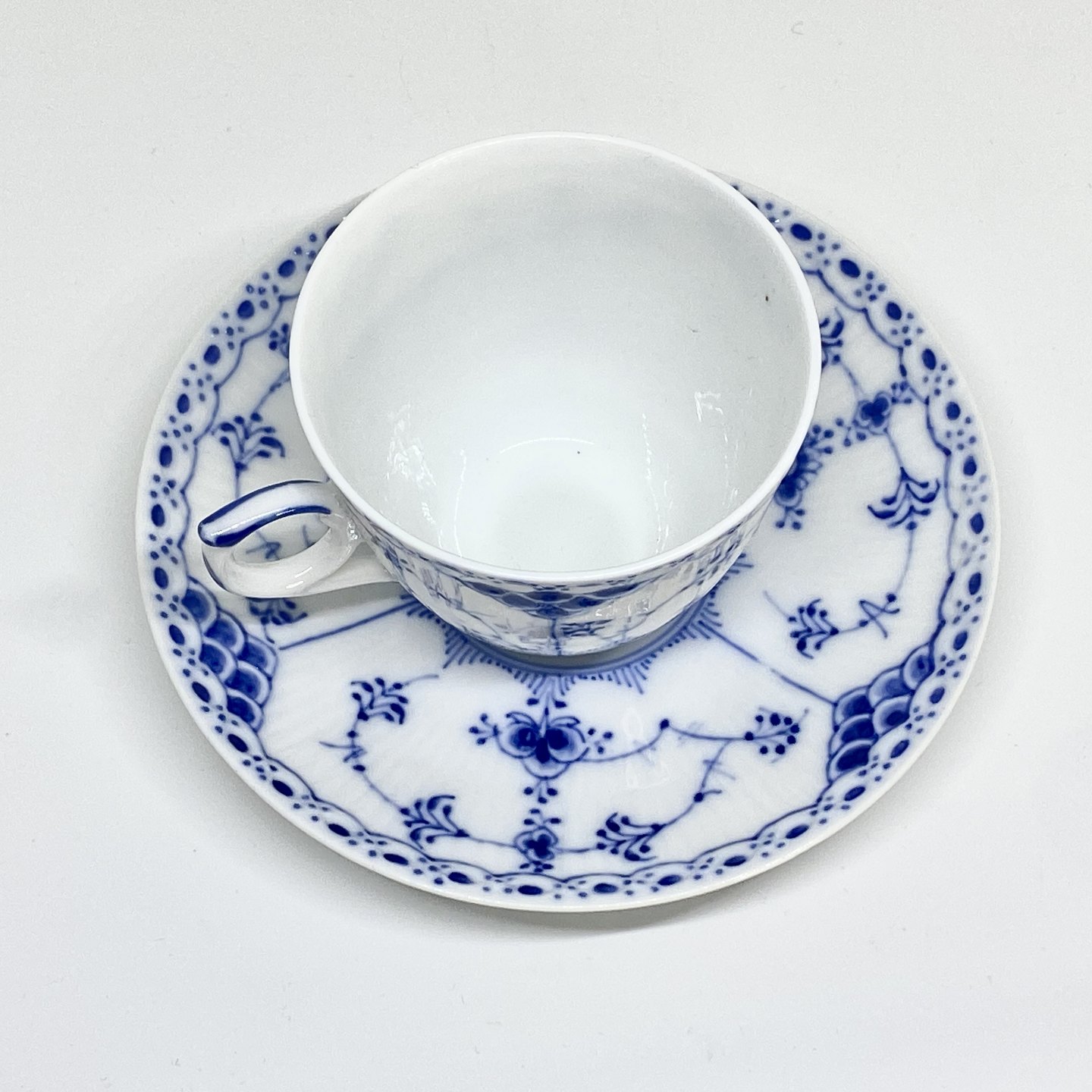 Beskrivelse: Royal Copenhagen/Kgl Musselmalet halvblonde kaffekop og underkop.