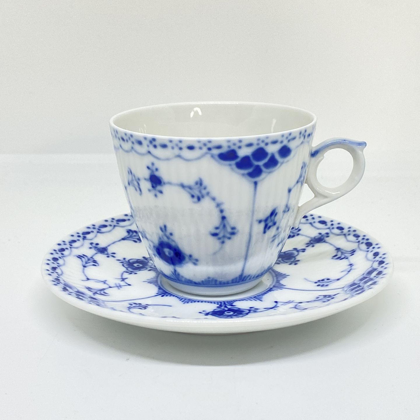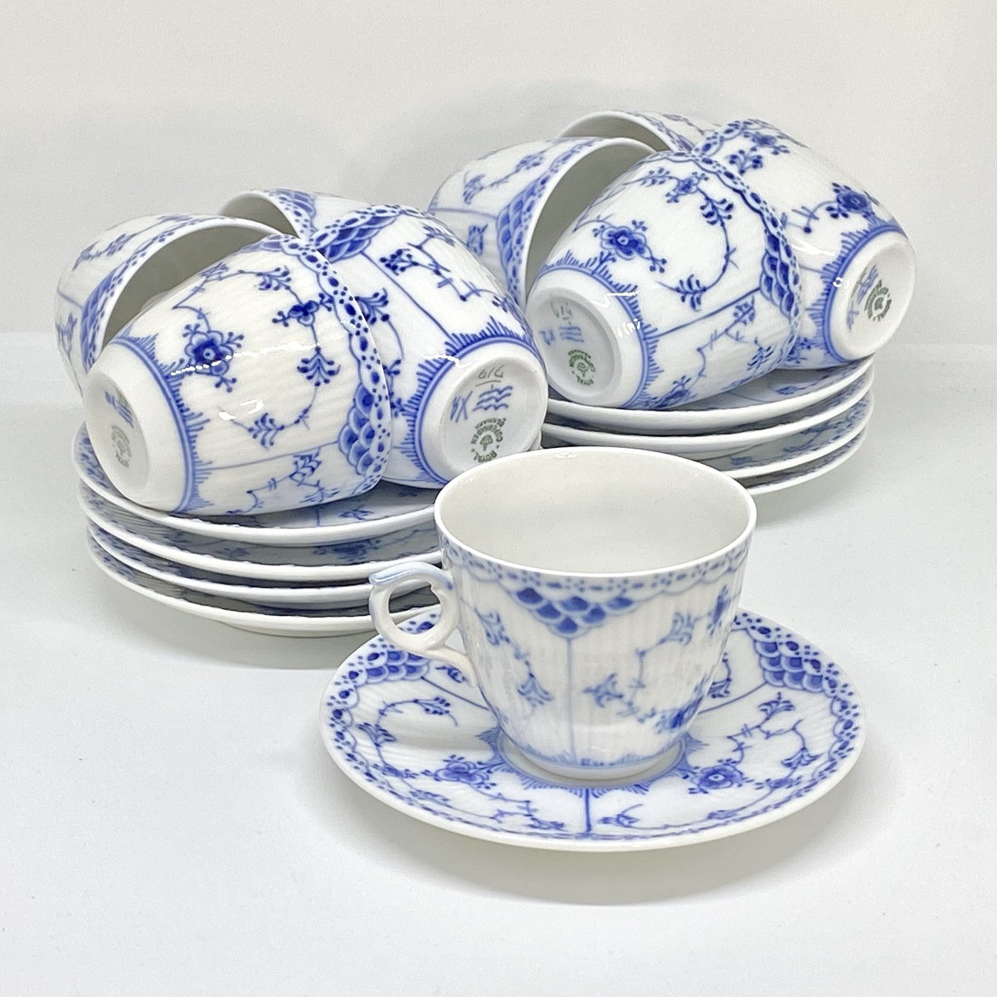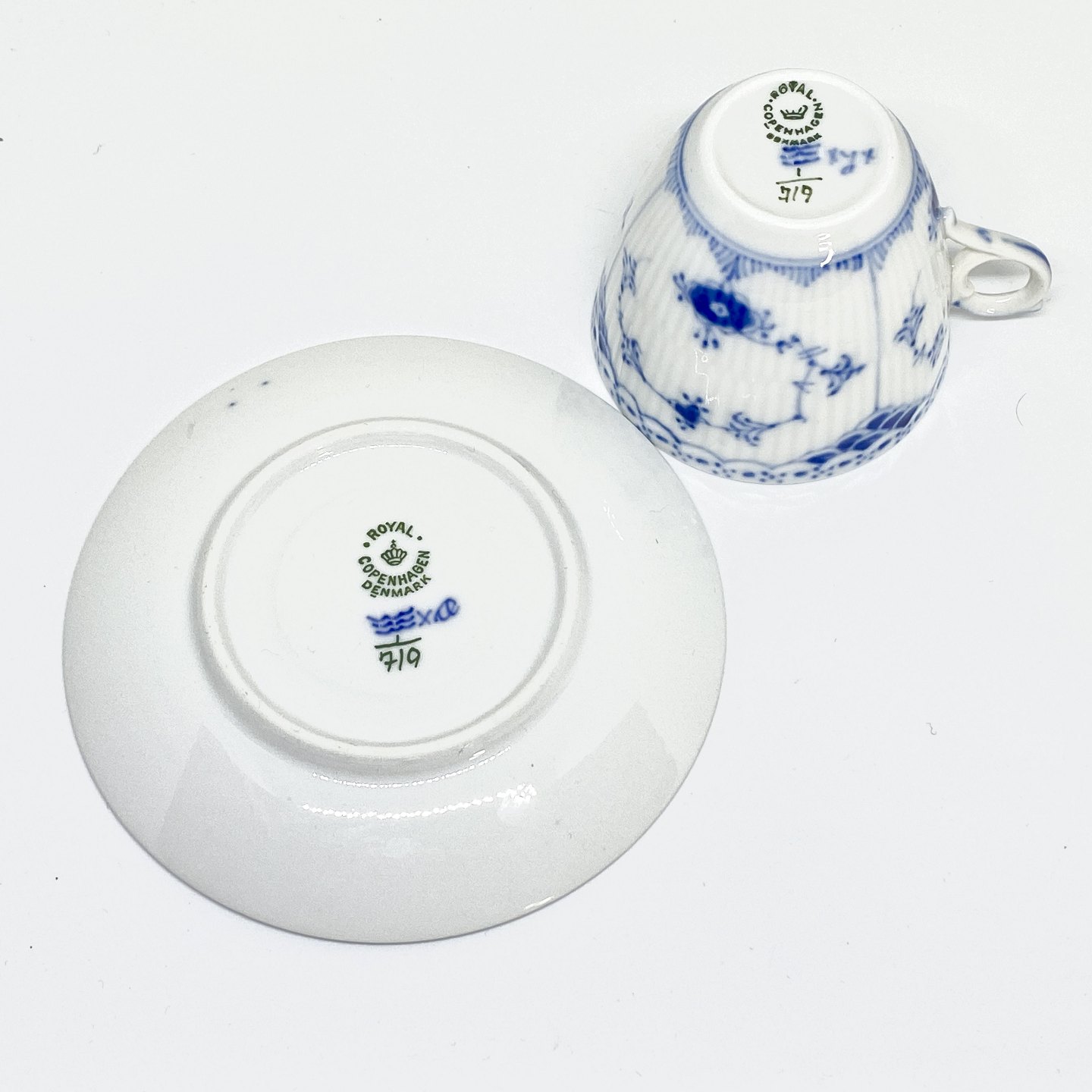 Beskrivelse: Royal Copenhagen/Kgl Musselmalet halvblonde kaffekop og underkop.