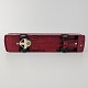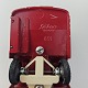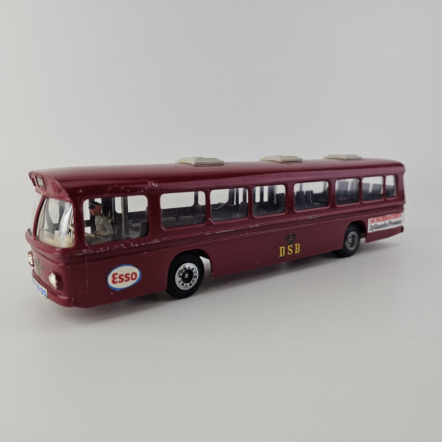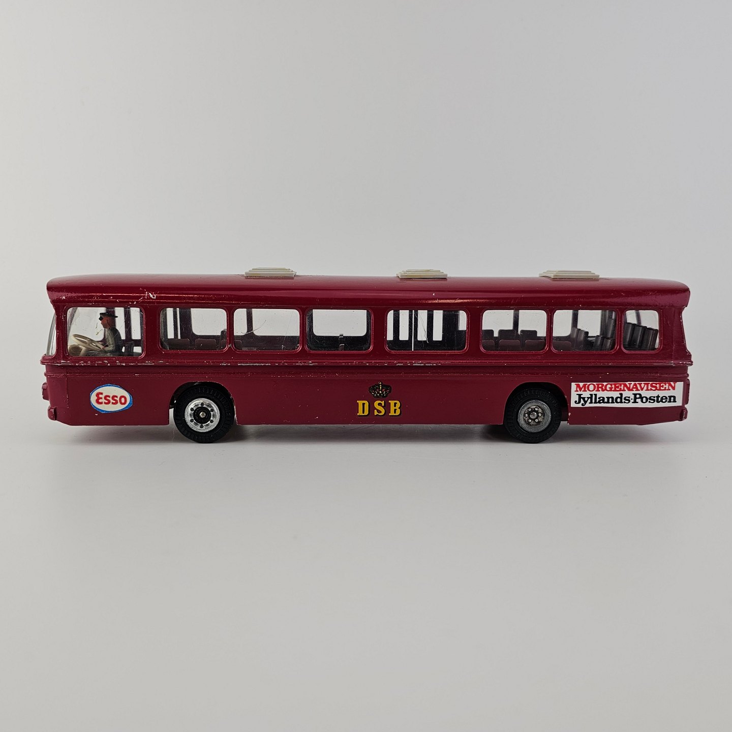 Beskrivelse: Legetøjsbil. Rødmalet DSB bus, Scania CR-76 med reklamer, chauffør og en baglåge, der kan åbnes