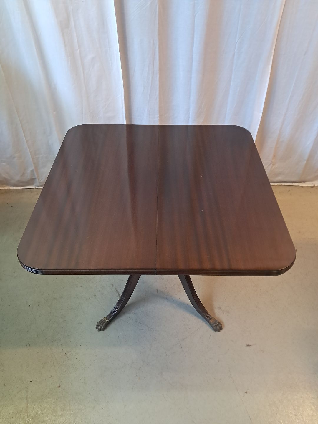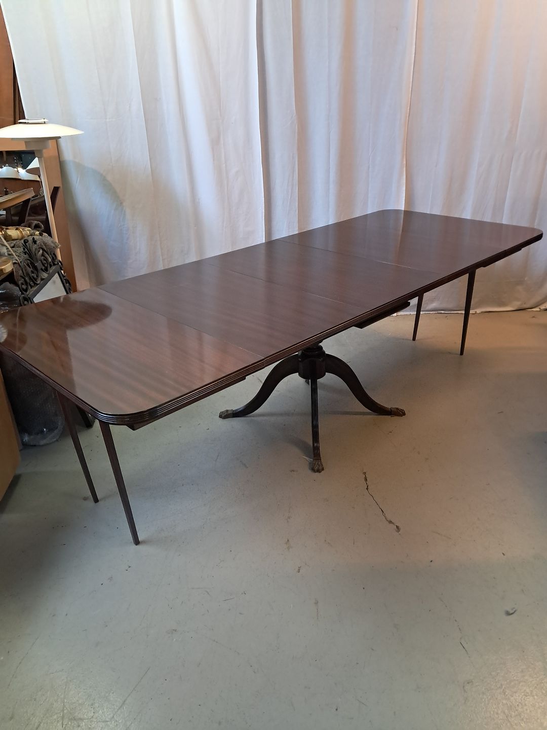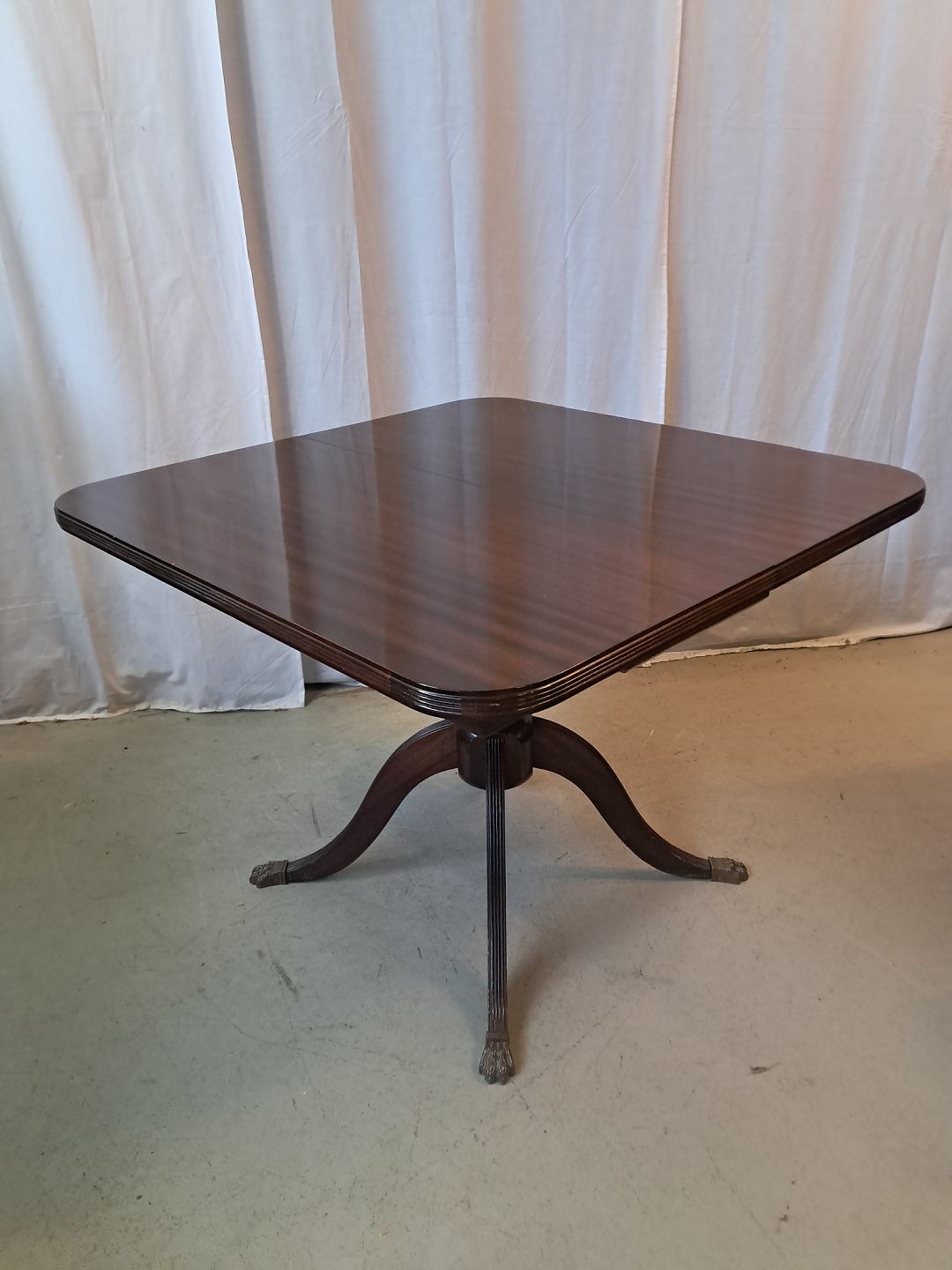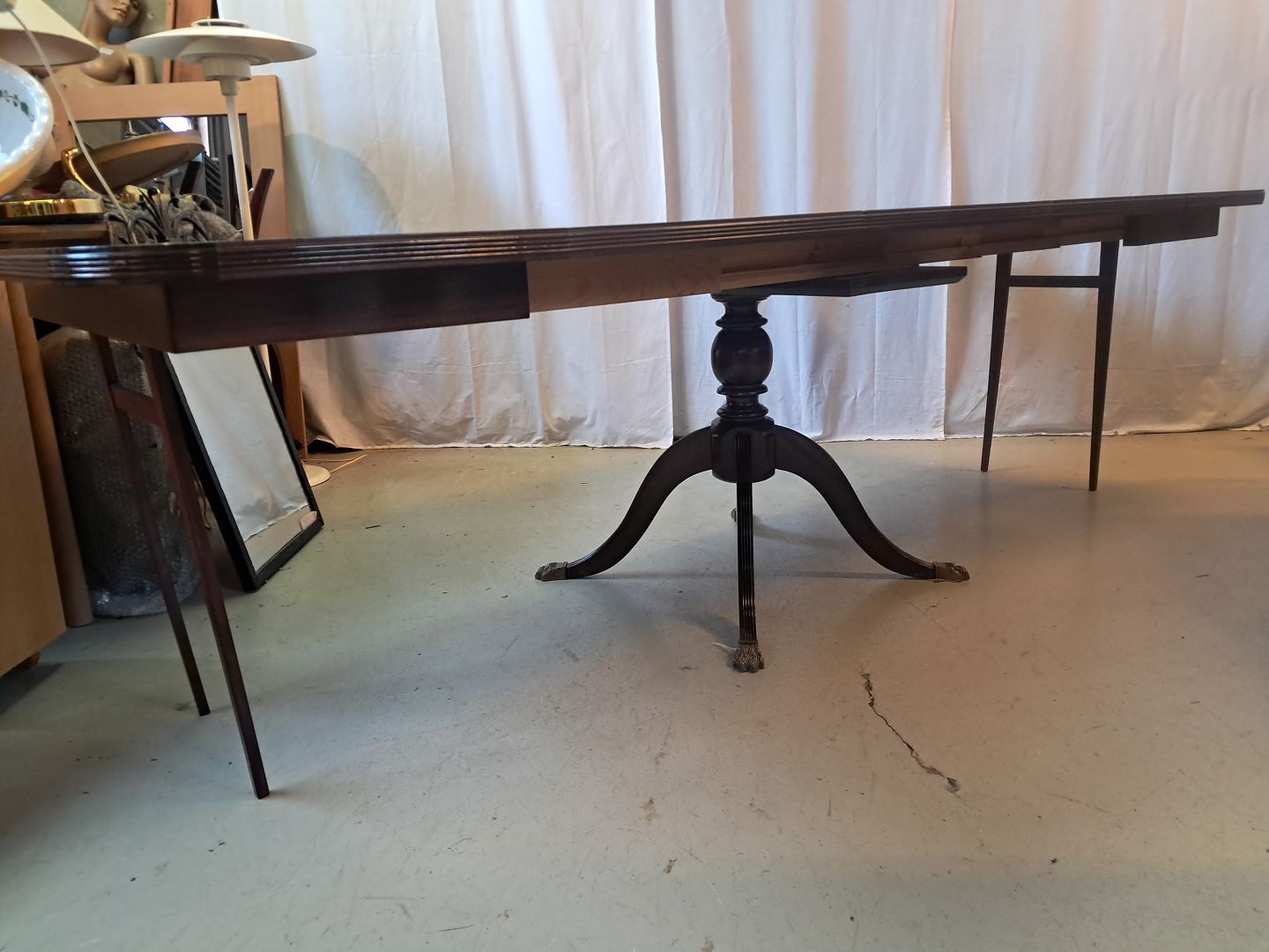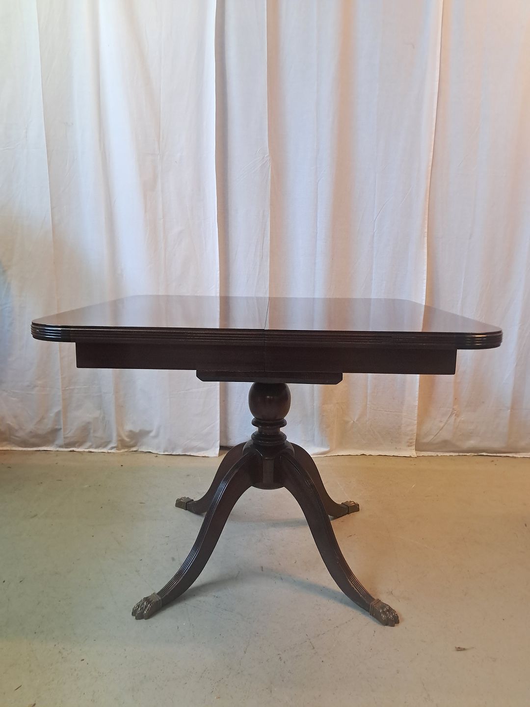 Beskrivelse: Spisebord i fineret mahogni med 3 tillægsplader, fra 1980erne.