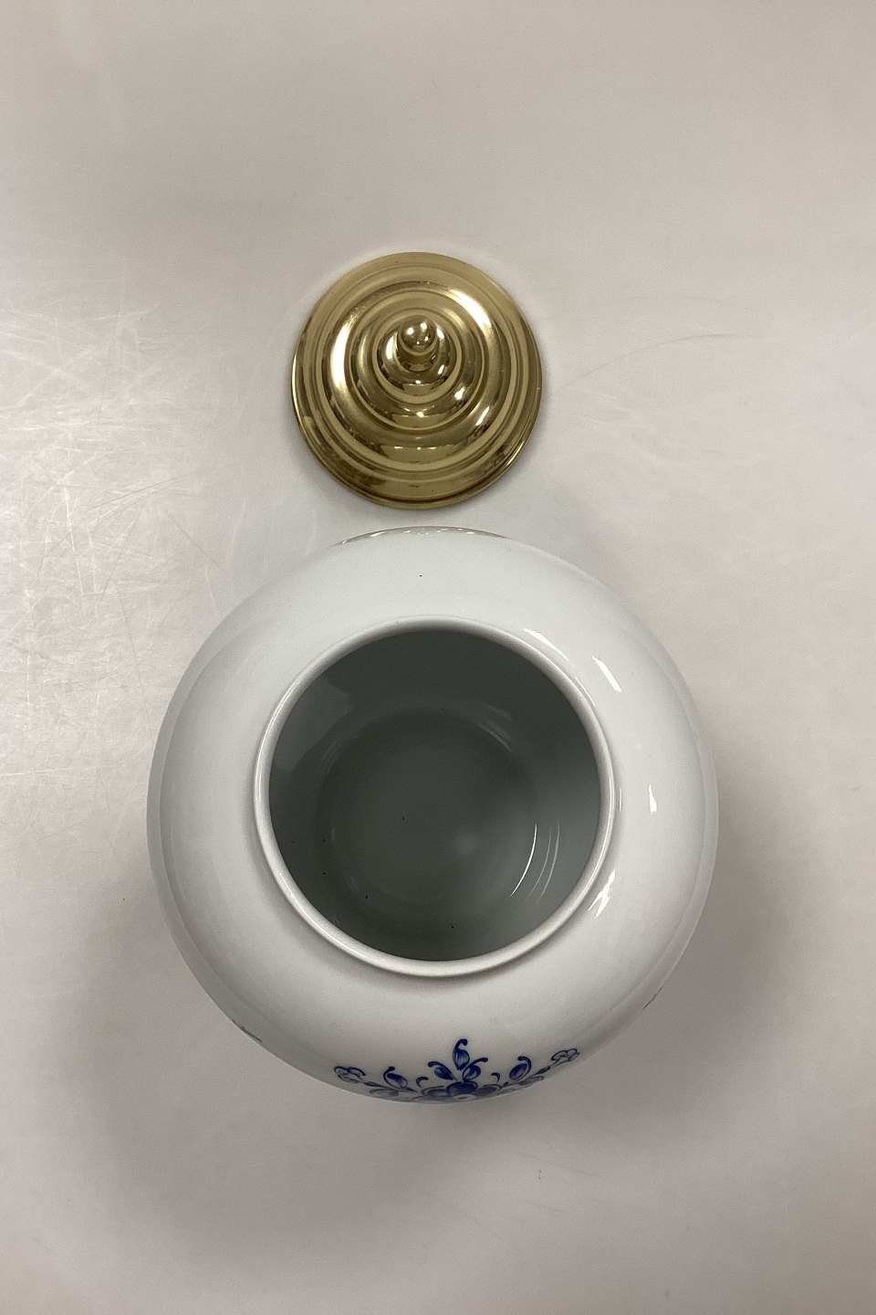 Beskrivelse: Bing og Grøndahl Tobakskrukke - Tabac No.6055/7148. Fremstillet i anledning af Skandinavisk Tobakskompagnis 25-års Jubilæum (1961-1986). Porcelæn med messinglåg. Logo på bagsiden: 1961 ST 1986.