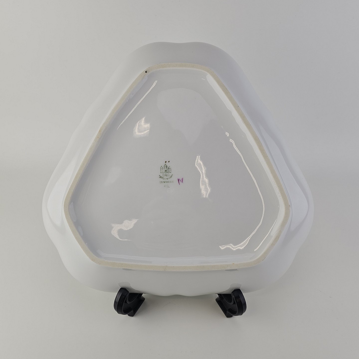 Beskrivelse: Trekantet fad til salt, peber og sennep i porcelæn fra stellet Antonius