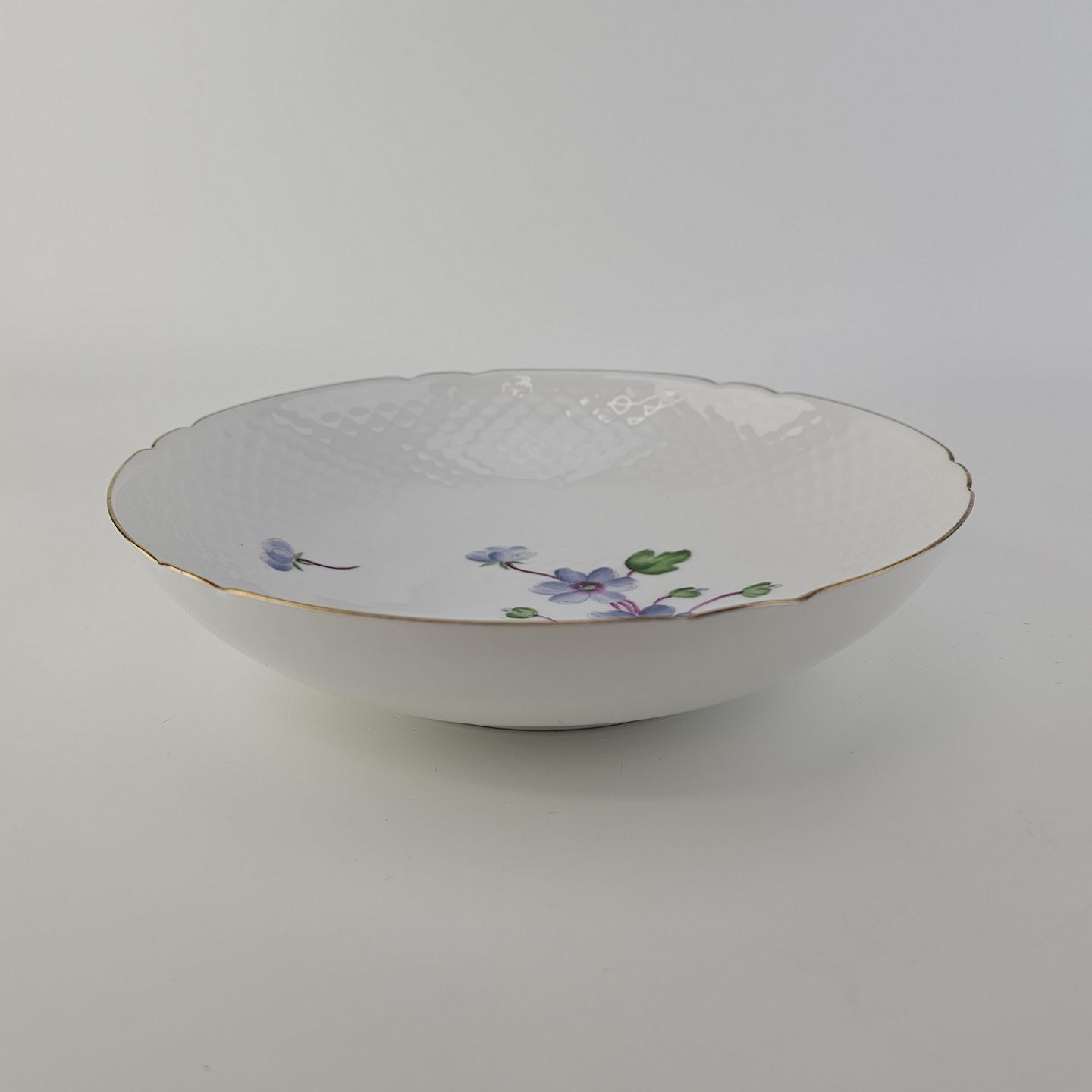 Antonius er af hvidt porcelæn med skælform dekoreret med håndmalede blå anemoner og guldkant. Også kendt under navnet Blå Anemone.