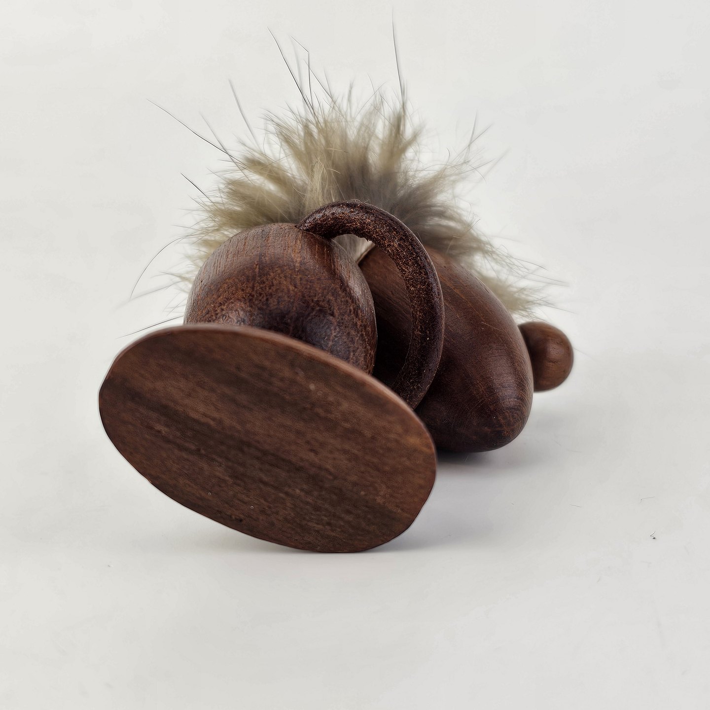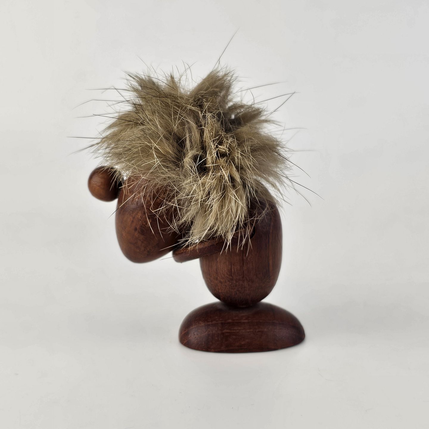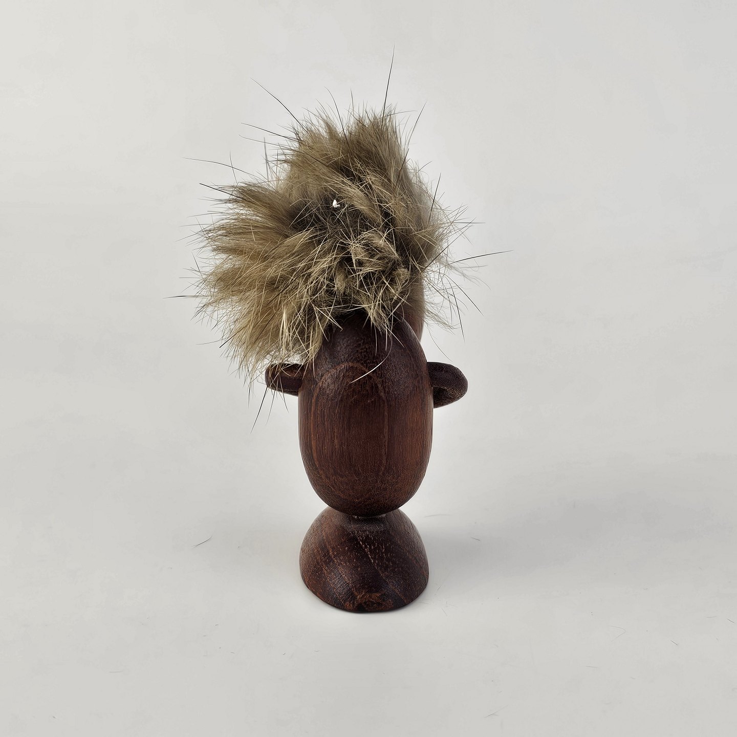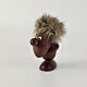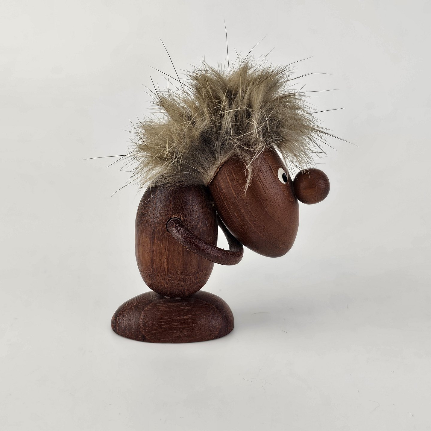 Beskrivelse: Håndskåret figur af teak med støvet blond hår og arme af læder. Fra 1960'erne