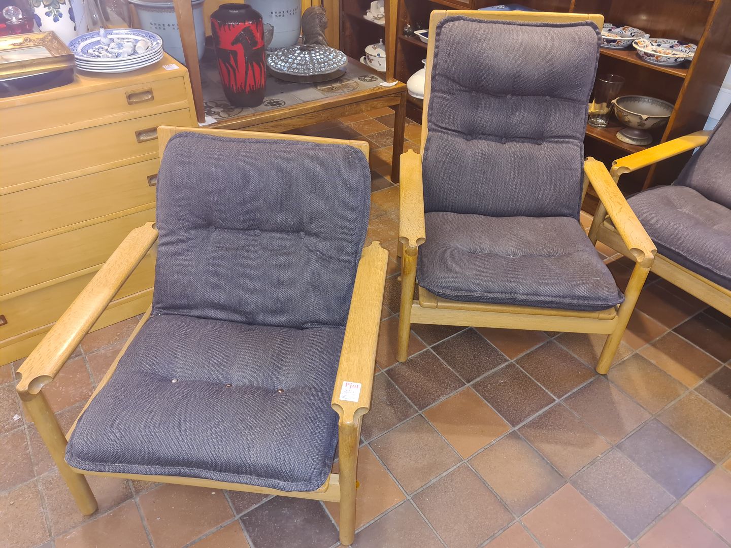 Beskrivelse: Sofagruppe udført i massiv lakeret eg m. hynder i uldstof. Produceret af Madsen & Schubell Møbelfabrik ca. 1970'erne. Fremstår i pæn brugt stand.