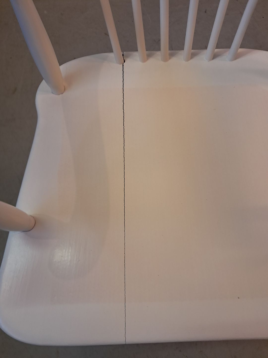 Den er stabil, men har brugsspor og en revne i sædet.