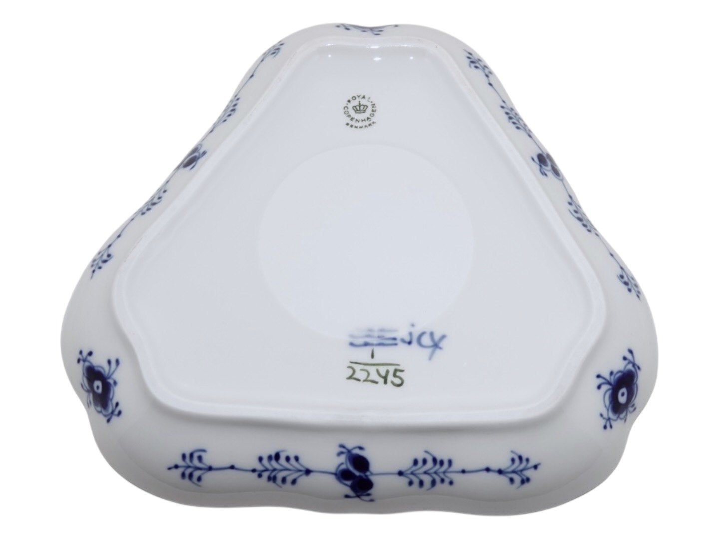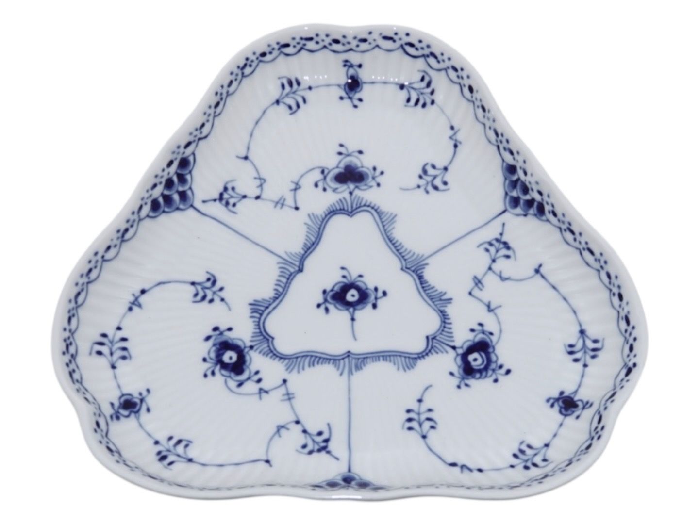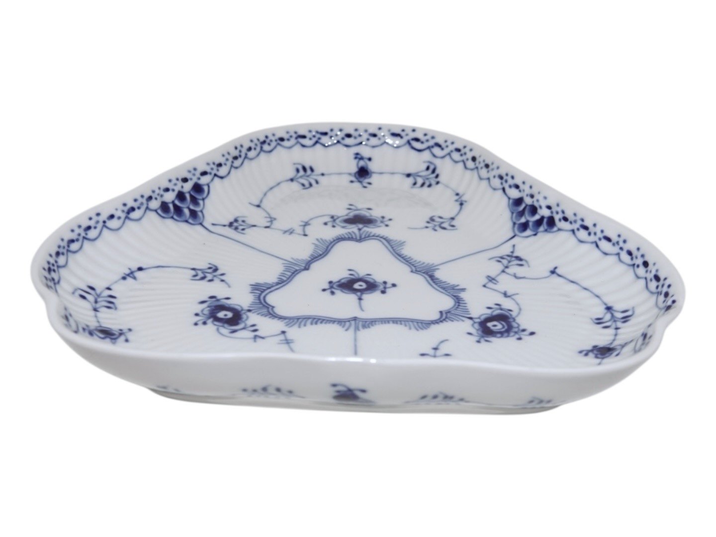 Beskrivelse: Royal Copenhagen Musselmalet Halvblonde, trekantet fad.