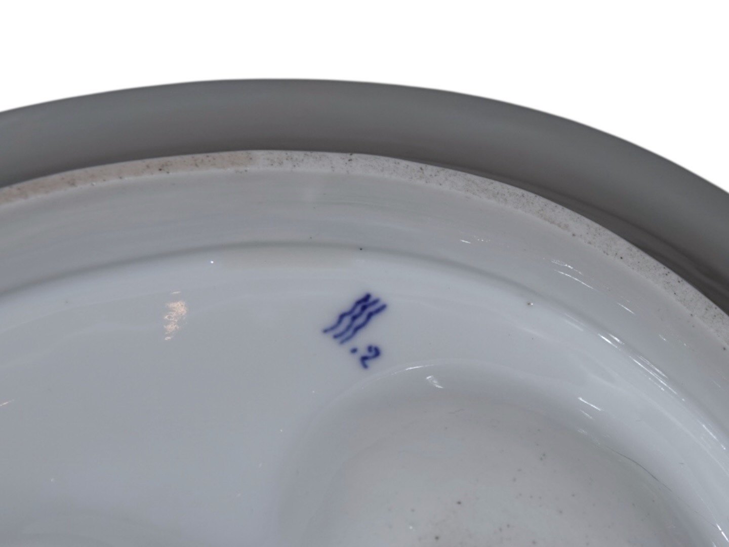 Beskrivelse: Royal Copenhagen Musselmalet Riflet, stort og sjældent fad til en steg, hvor kødsafterne kan løbe ned i fordybningerne.