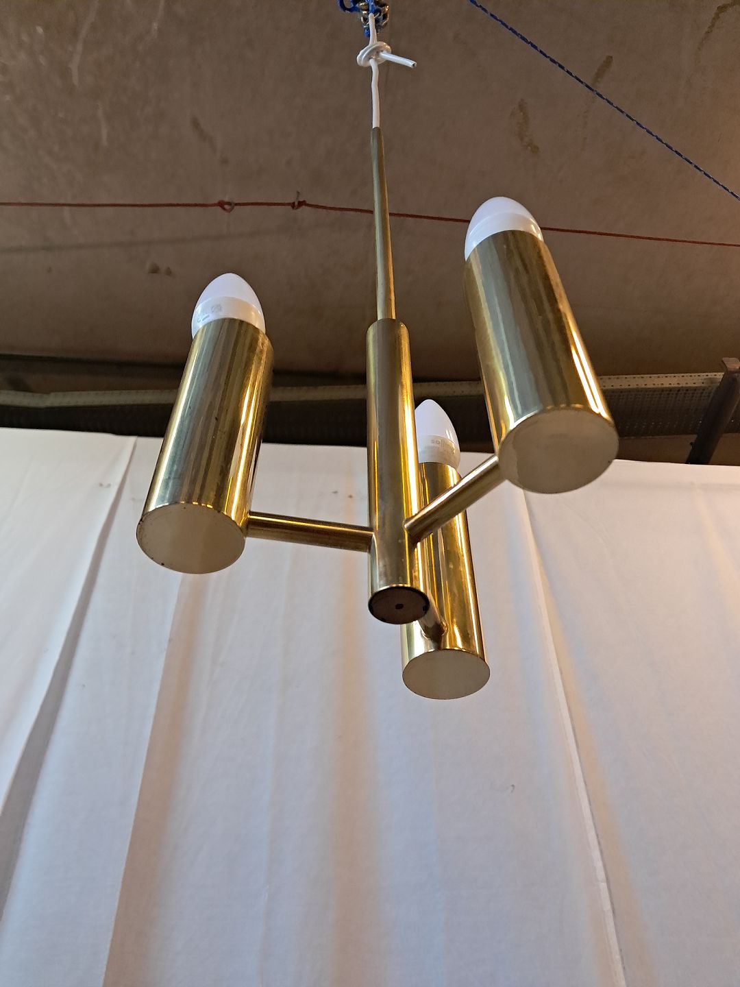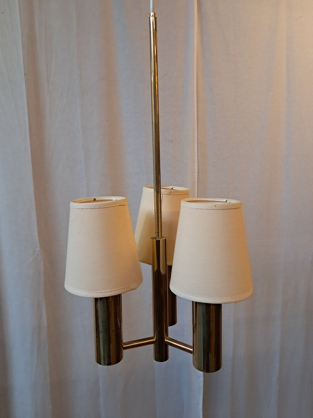 Beskrivelse: Loftlampe i messing med skærme, fra 1950erne.
