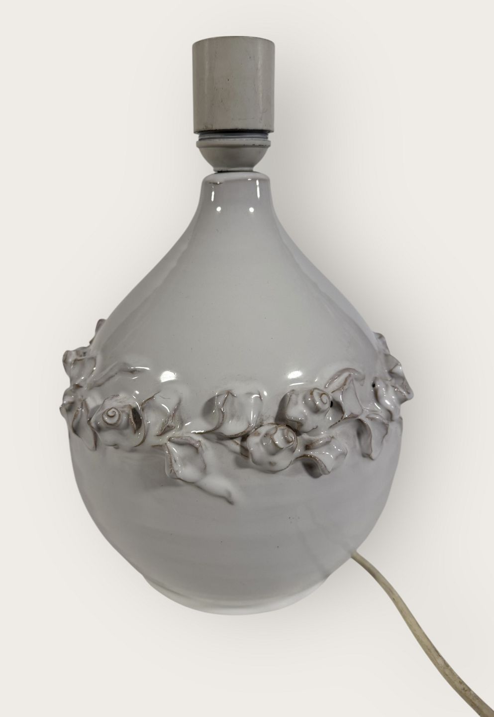 Beskrivelse: Torben Keramik, Stor hvid bordlampe med blomsterranke, højde med fatning 27,5cm, signeret Torben Danmark 175 *Fin stand*