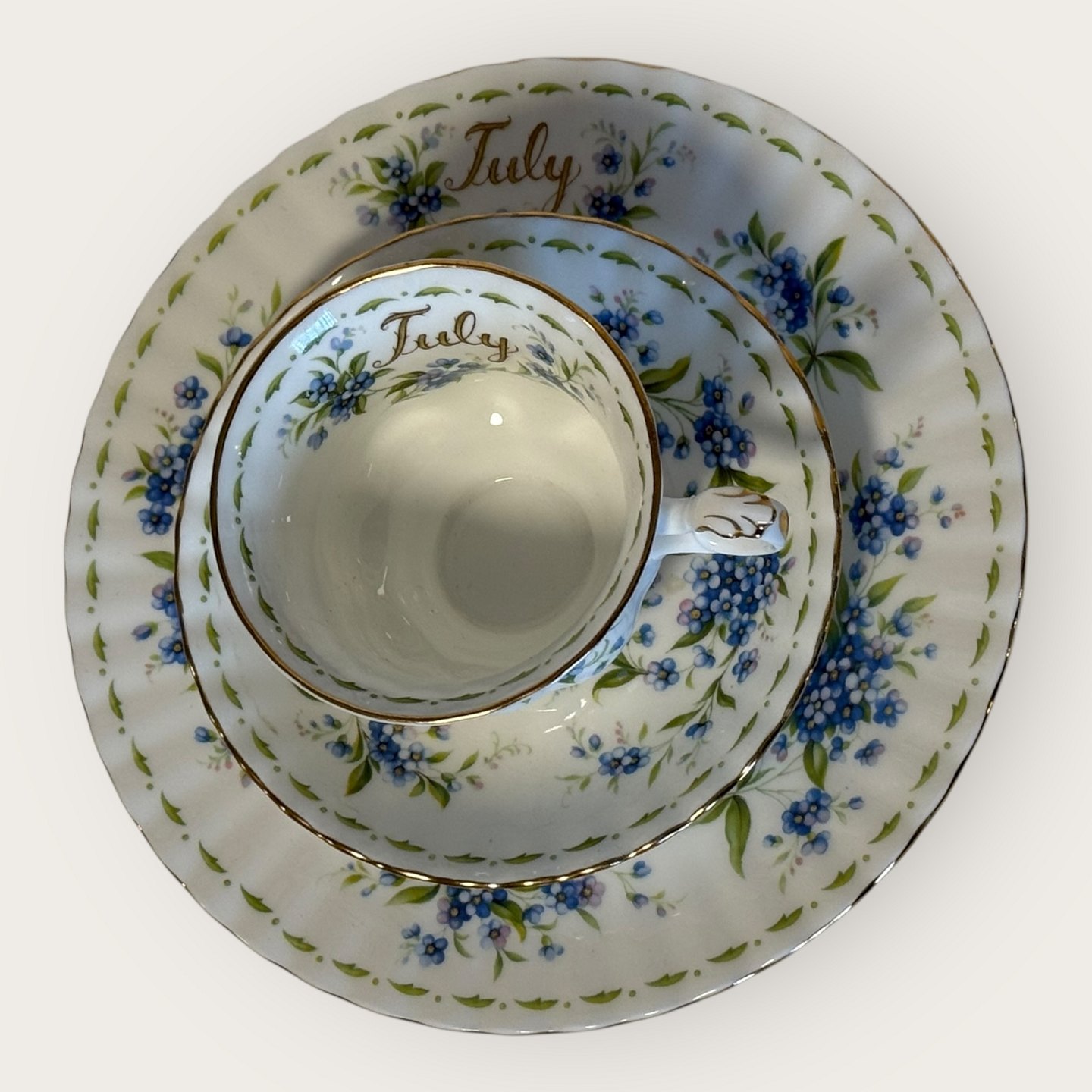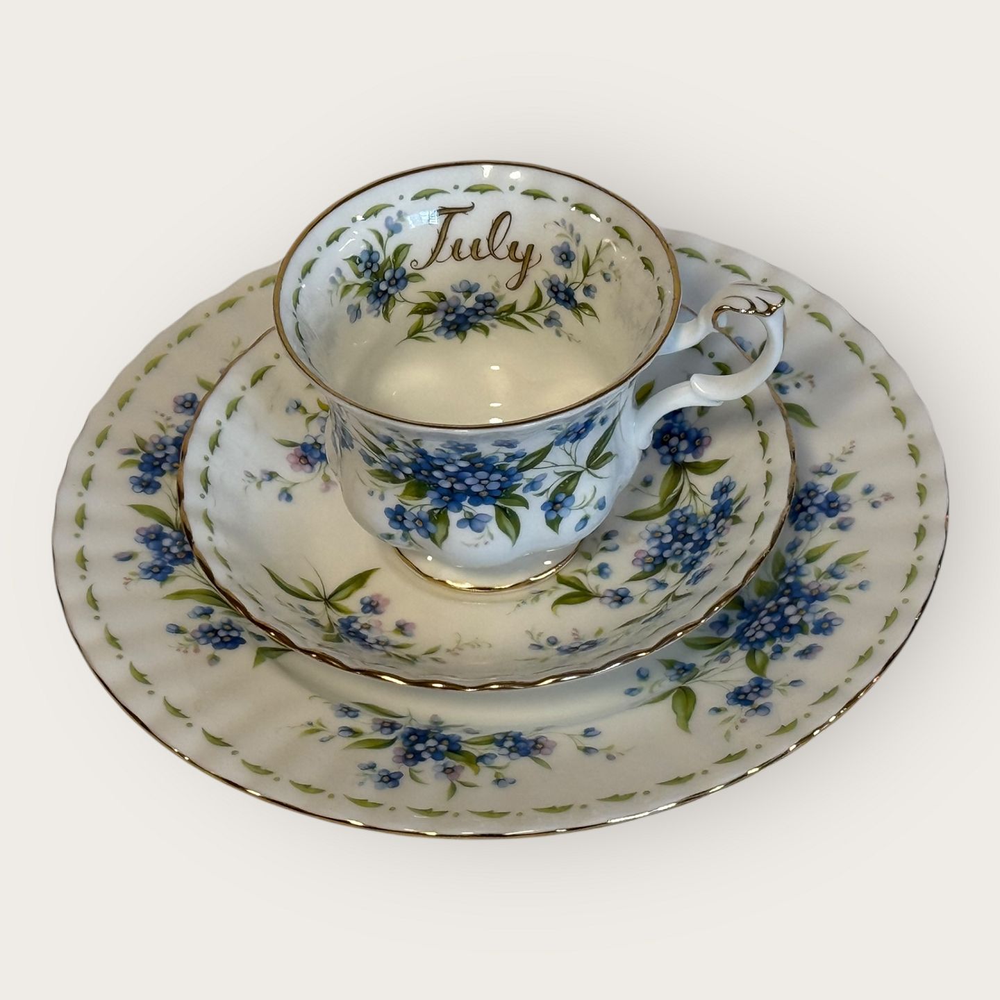 Beskrivelse: Royal Albert, Flower of the month, Trio sæt med kop, underkop og kagetallerken, tallerken har diameter 20,5cm, koppen har diameter 9cm og højde 7cm *Fremstår i perfekt stand*