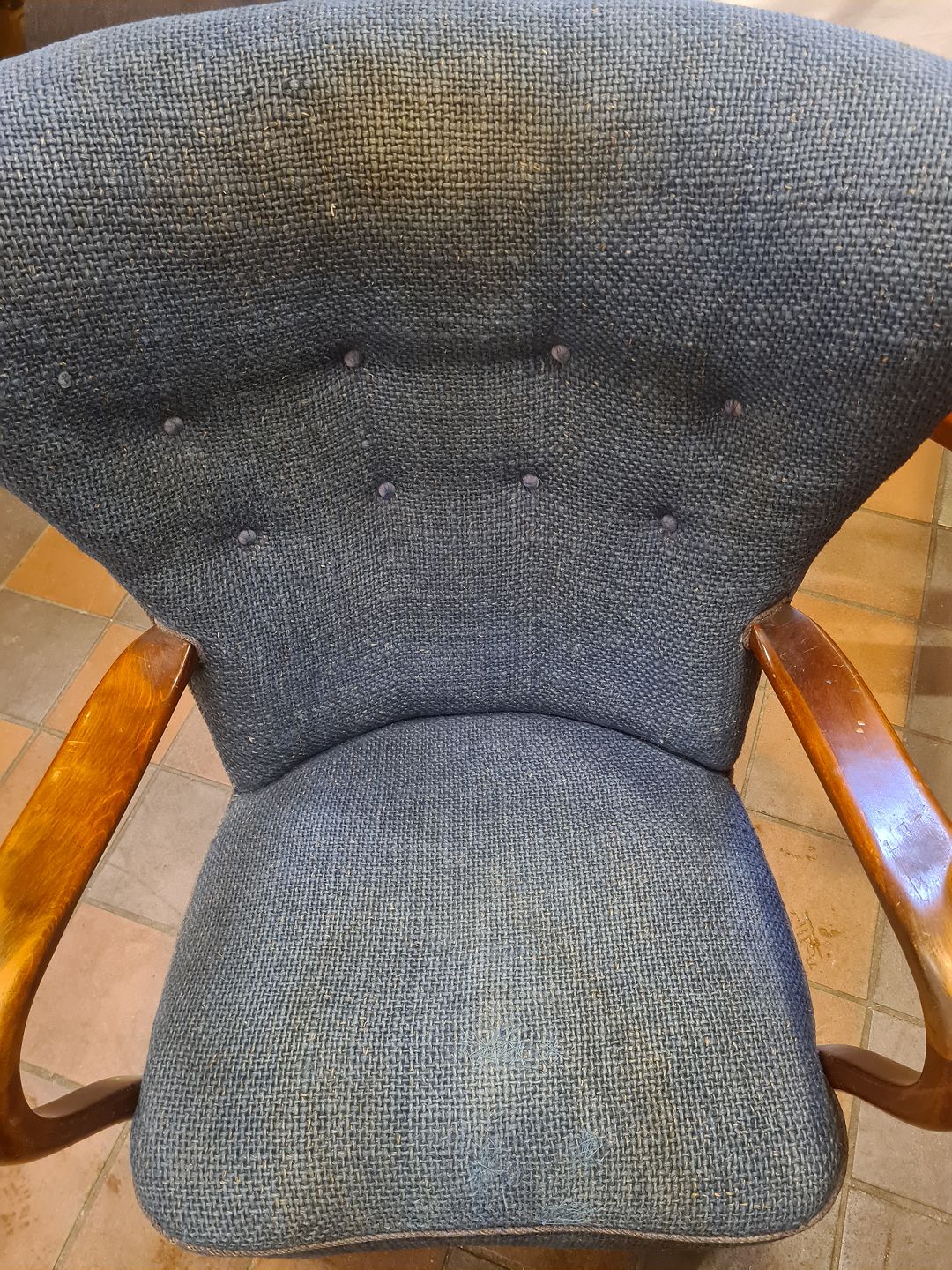 Beskrivelse: Alfred Christensen overpolstret lænestol model: 23B udført m. stel i bejdset bøg og betrukket med uld stof. Fremstillet hos Slagelse Møbelværk ca. 1950'erne.