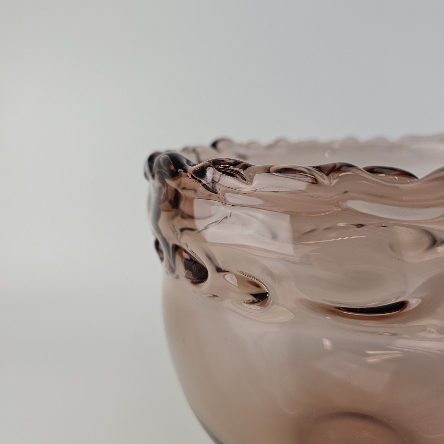 Beskrivelse: Skål i rosafarvet glas med bølget kant fra serien Rosamund