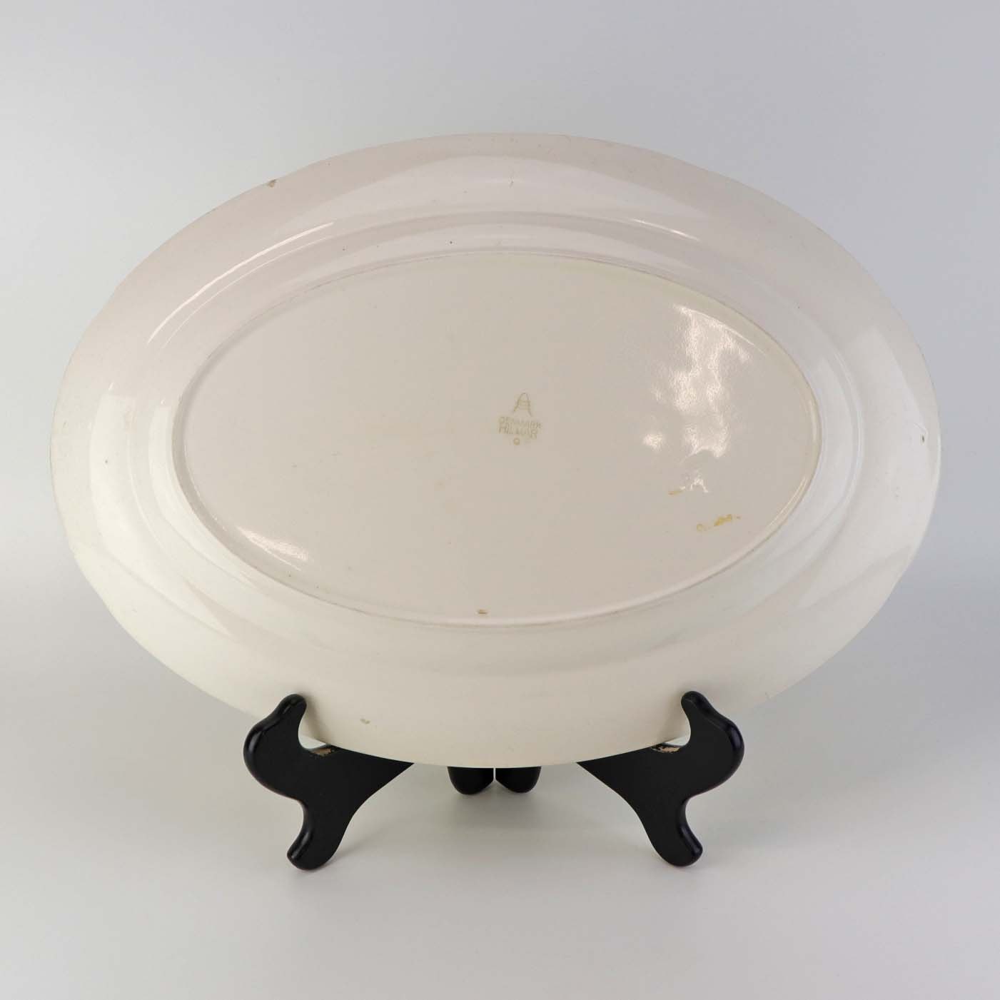 Beskrivelse: Stort ovalt serveringsfad fra stellet Hilmar, som blev fremstillet i perioden 1940-1954