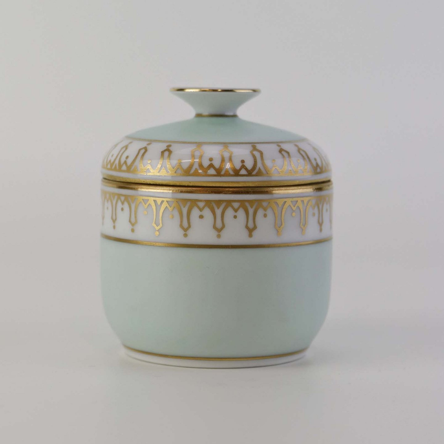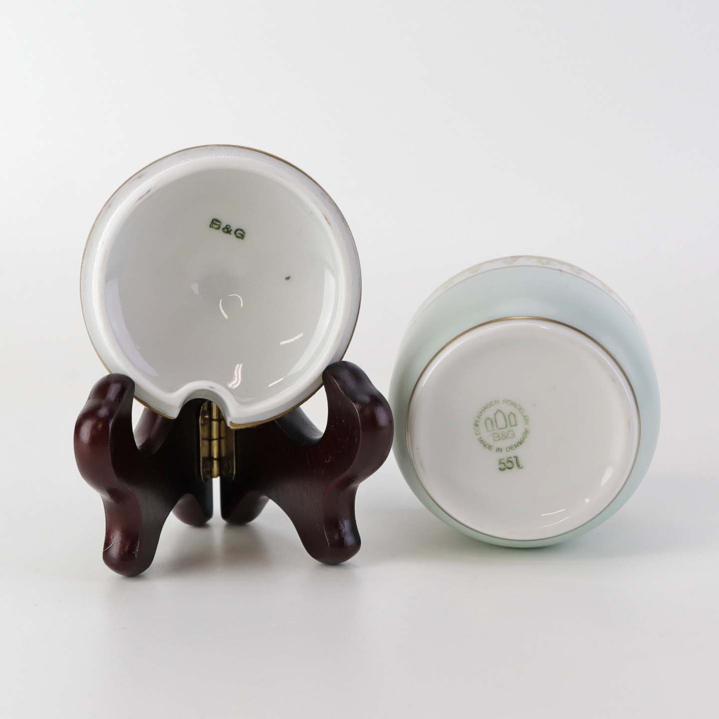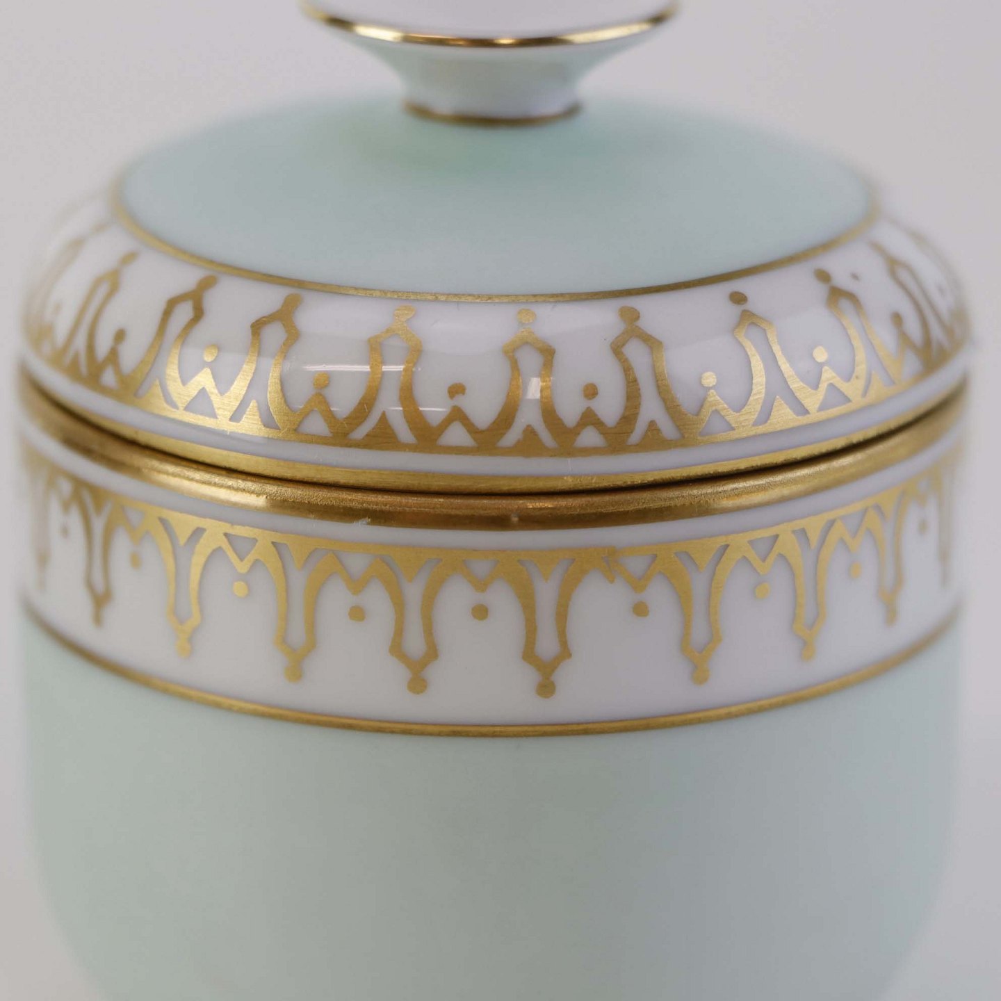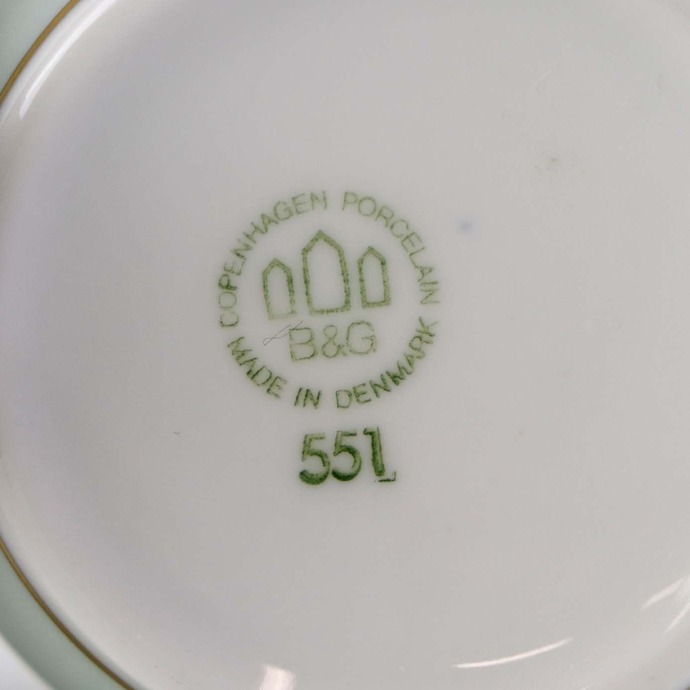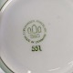 Thorvaldsen er stel i glat hvidt porcelæn med lysegrøn bort, forgyldt dekoration og guldkant