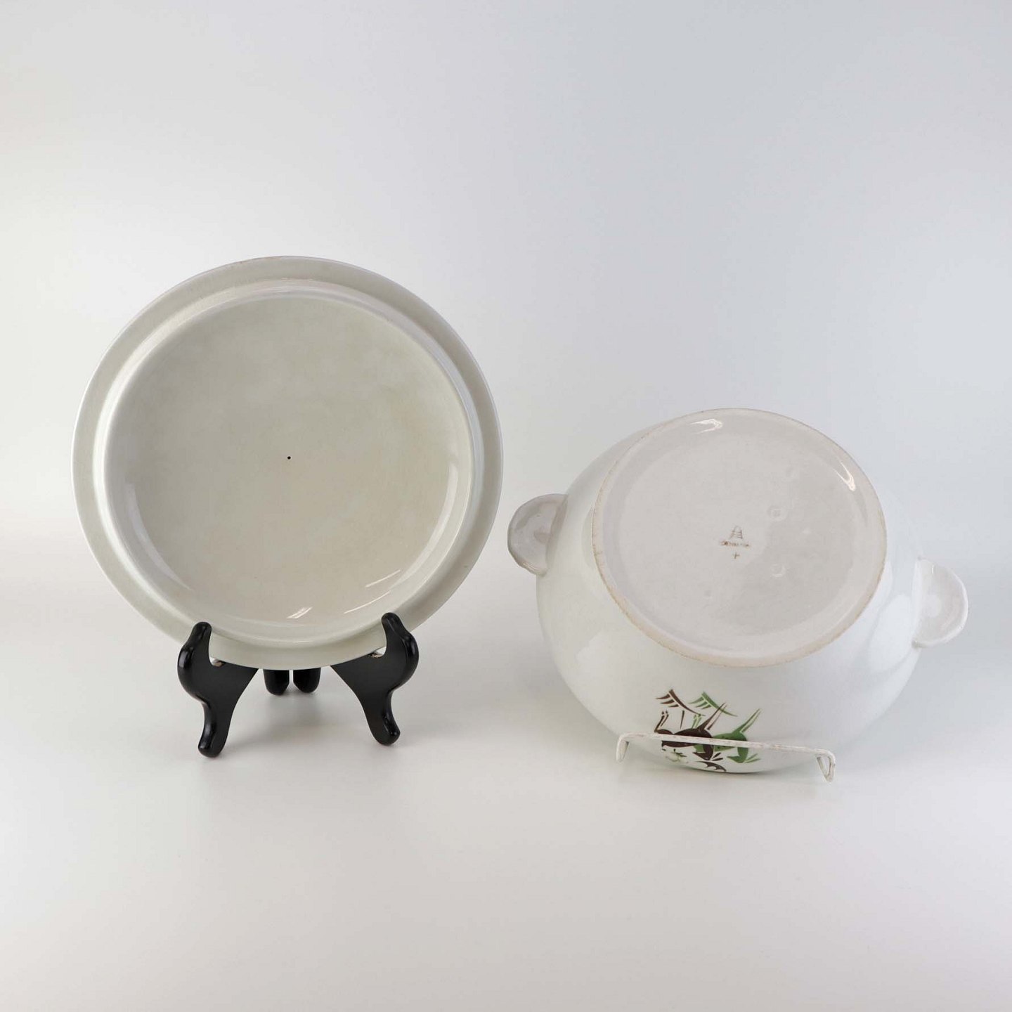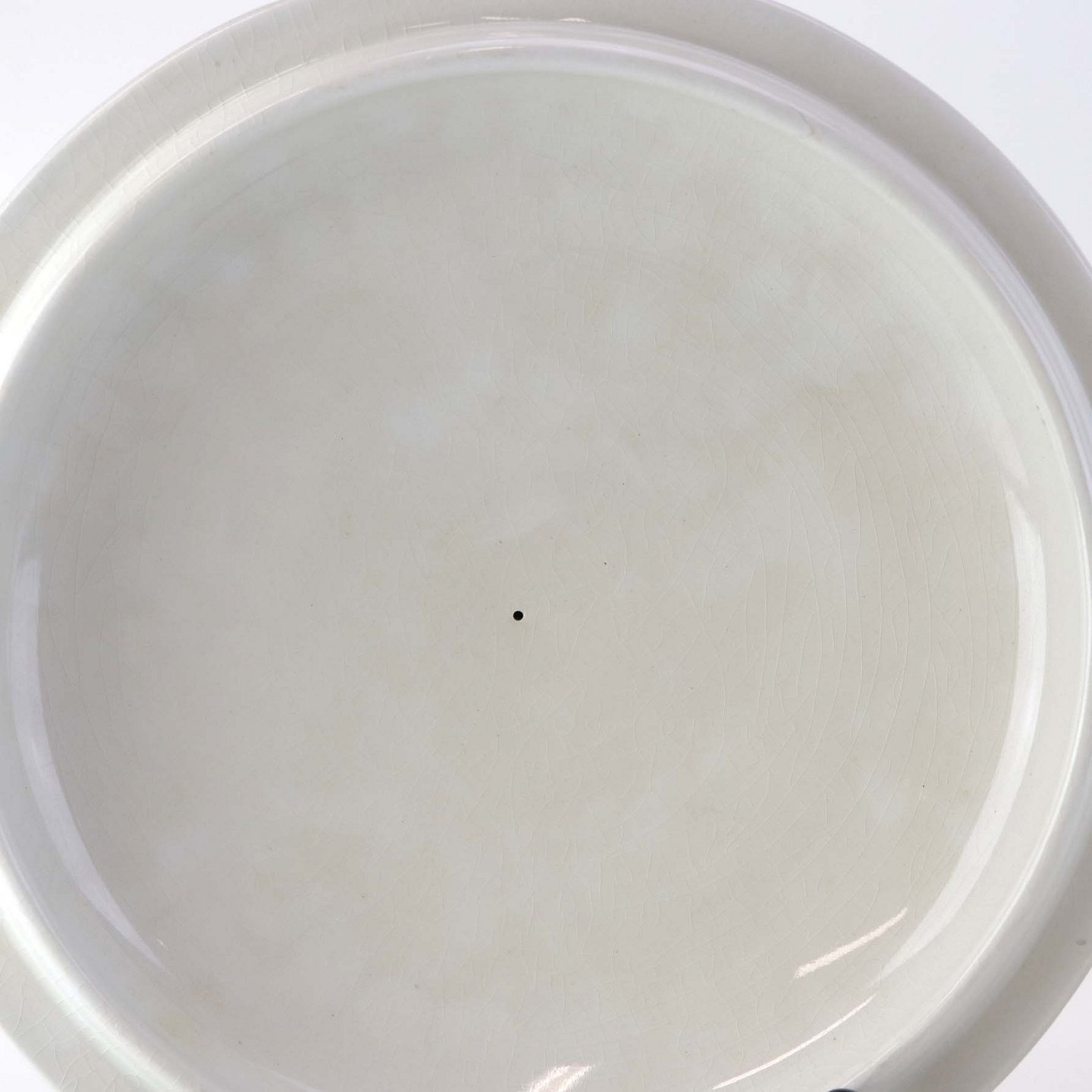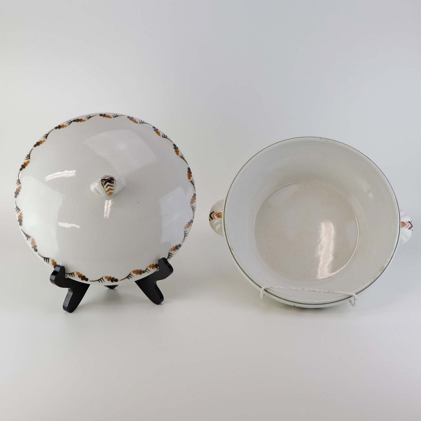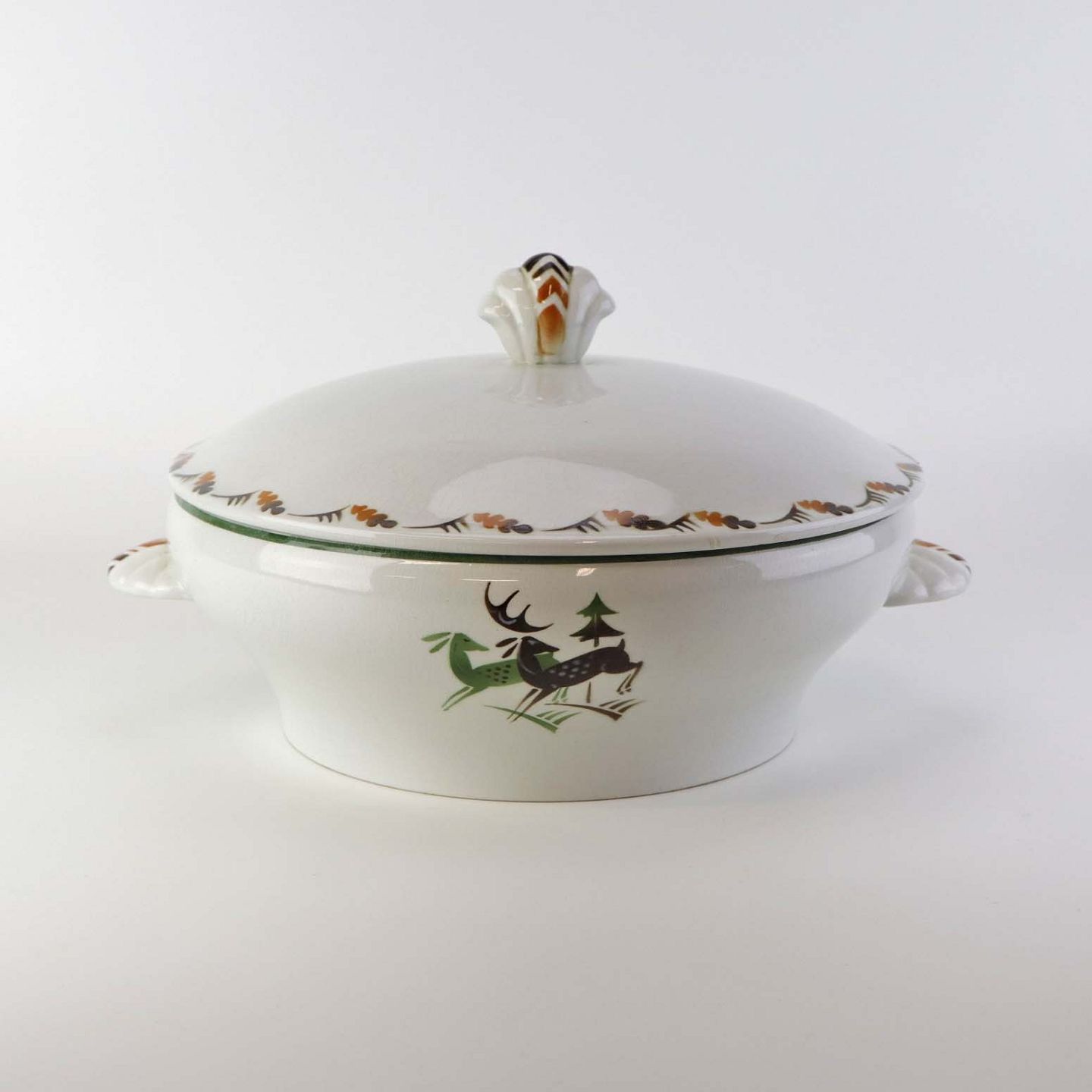 Beskrivelse: Terrin med låg i fajance fra Hjortestellet Convolvolus, som blev fremstillet i perioden 1930-1940
