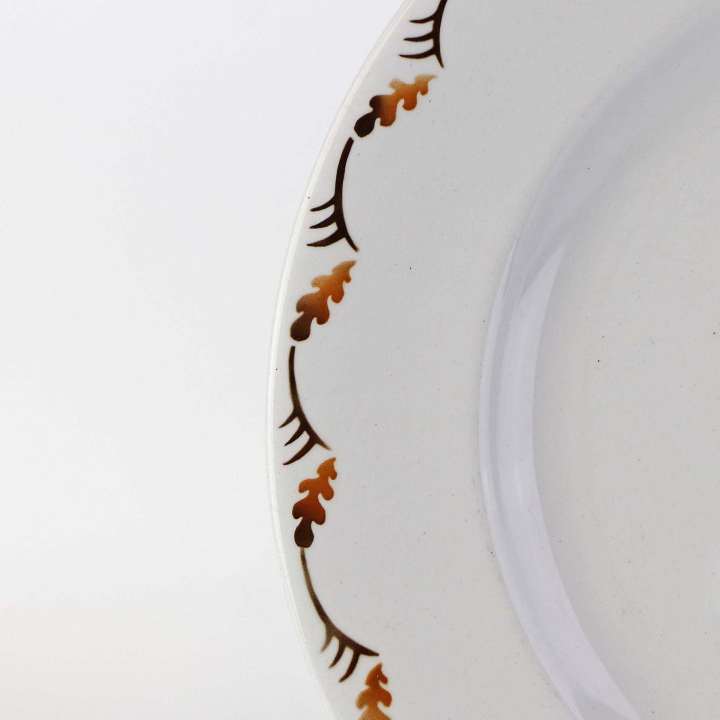 Beskrivelse: Flad middagstallerken i fajance fra Hjortestellet Convolvolus, som blev fremstillet i perioden 1930-1940