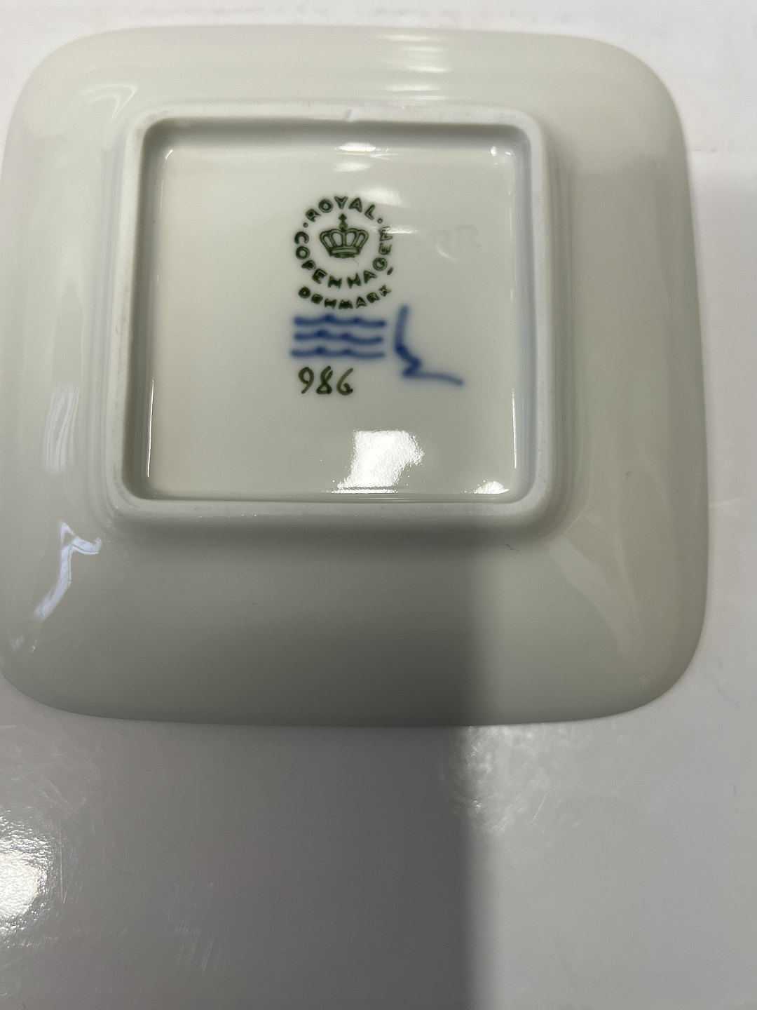 Description: Royal Copenhagen Square Asia (originally an ashtray) with a leaf