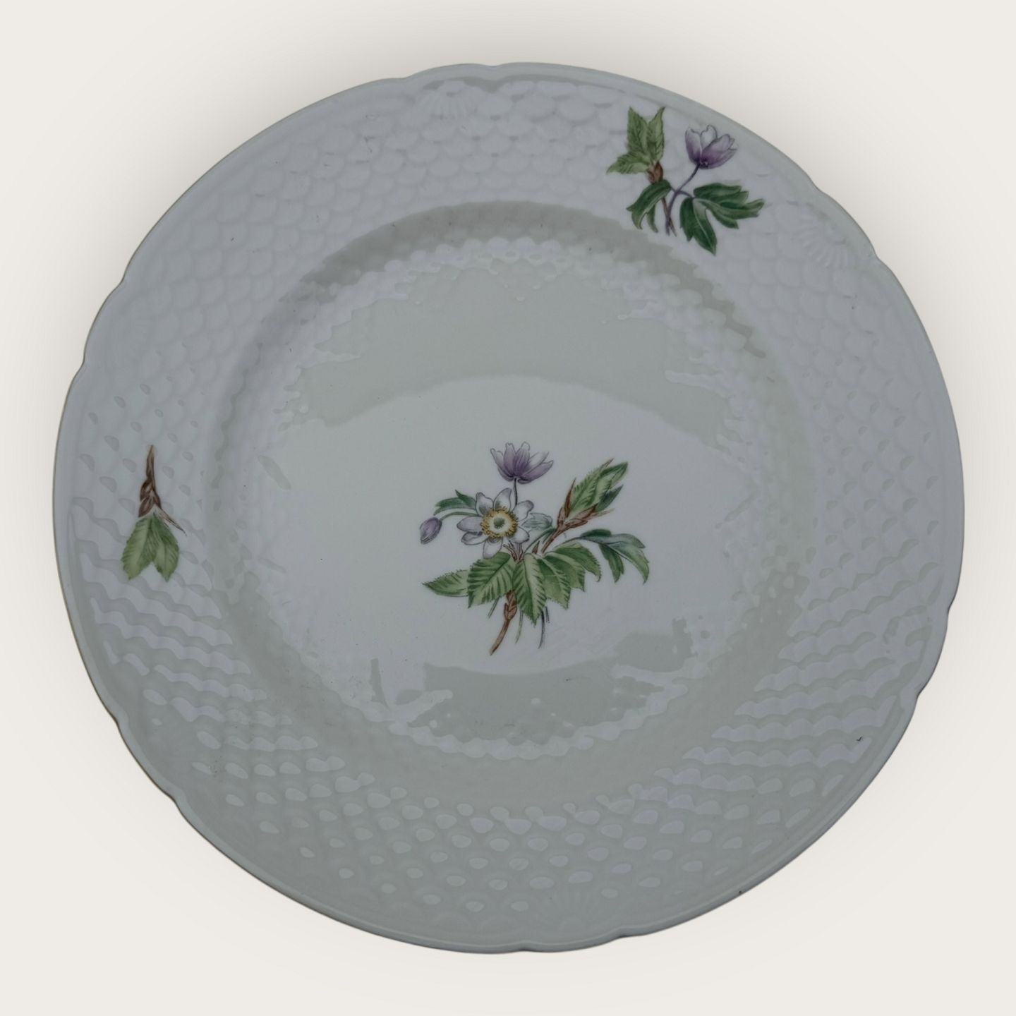 Beskrivelse: Bing & Grøndahl, Frigga, Anemone, # 28, flad middags tallerken, diameter 24,5cm, 1. sortering *Pæn stand*