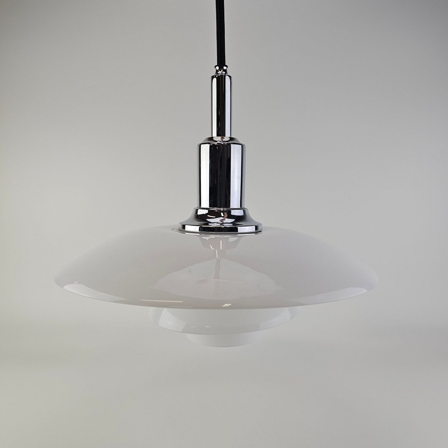 Beskrivelse: Loftlampe i hvidt opal glas med fatning i forkromet metal
