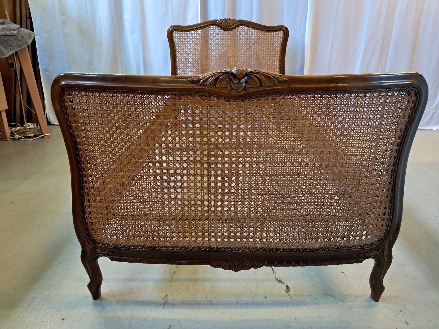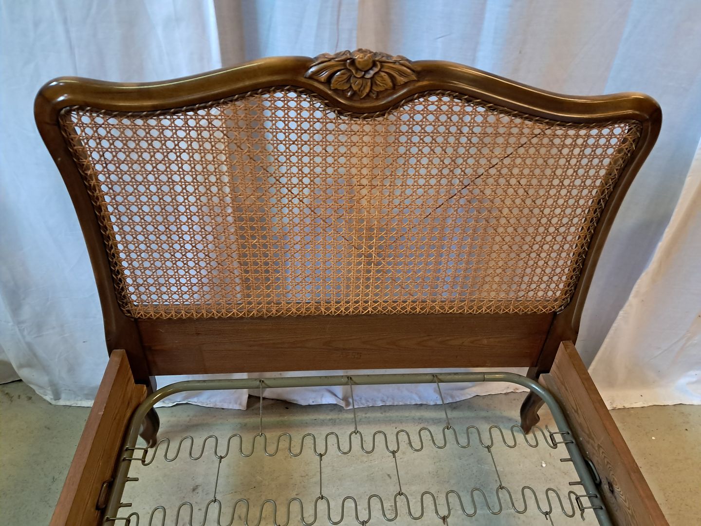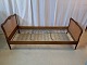 Beskrivelse: Seng i nødetræ med rørflet, fra 1950erne.