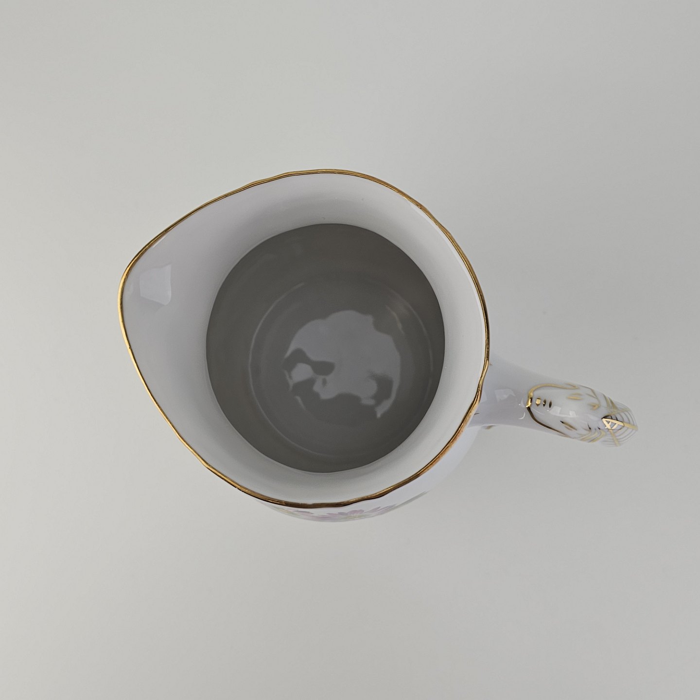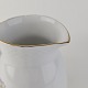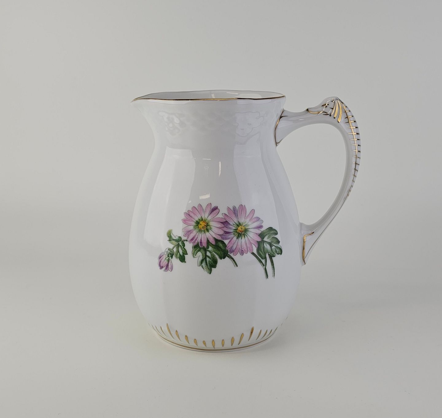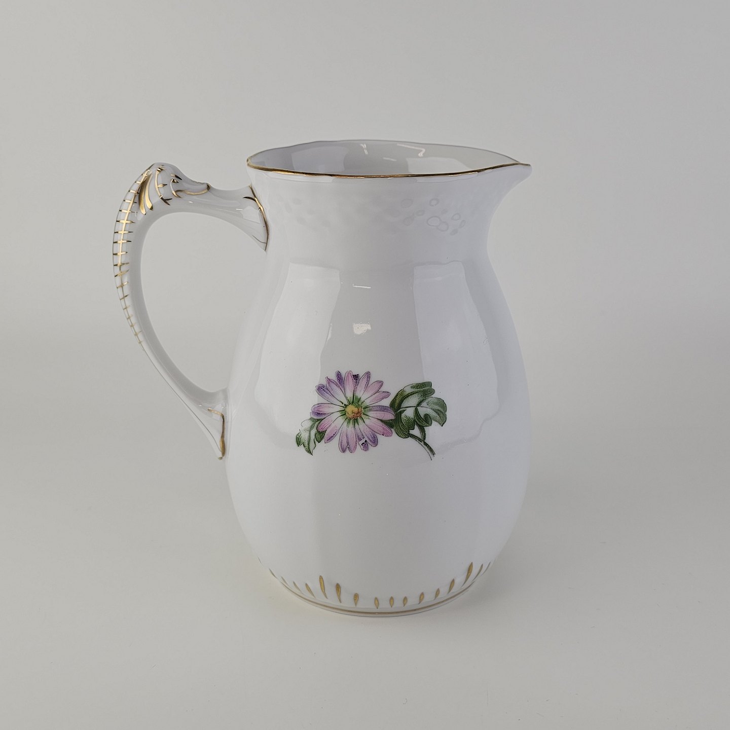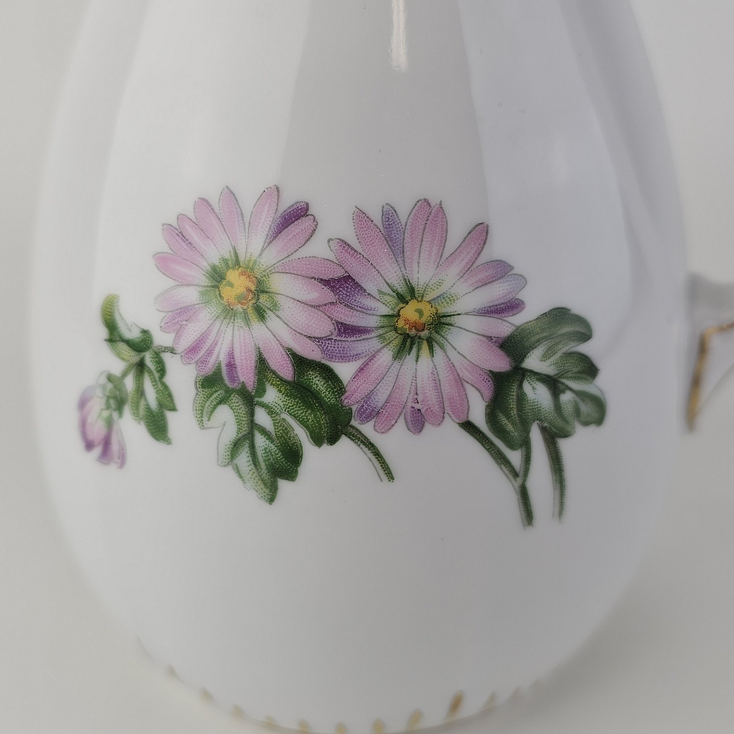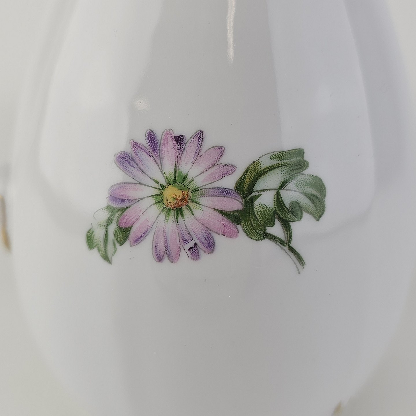 Krysantemum er hvidt porcelæn dekoreret med lys lilla blomst, grønne blade og guldkant.