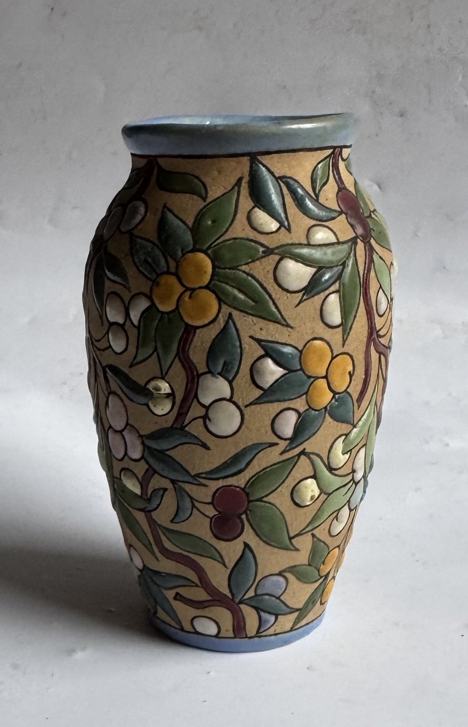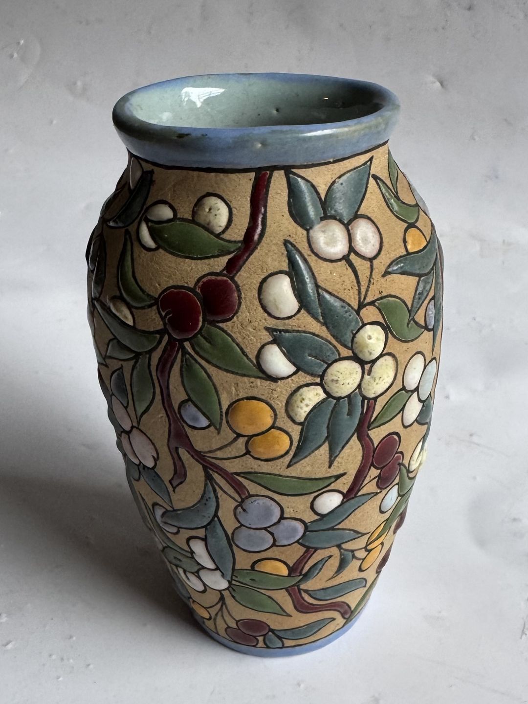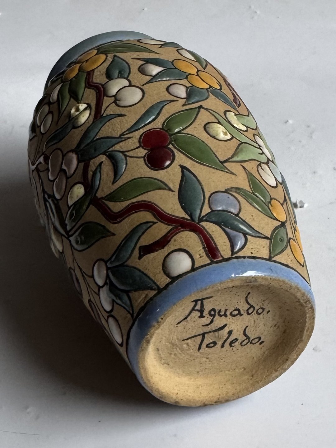 Beskrivelse: Arguado Toledo vase i keramik med farverig emalje blad og bær dekoration rundt om vasen. Grundlæggeren af dette produkt José Aguado Villalba (1919-2007) havde en mangeårig produktion af keramik i lignende stil fra midten af 1960’erne til i slutningen af 1980’erne i Toledo i Spanien. Vasen er 10,7 cm høj.