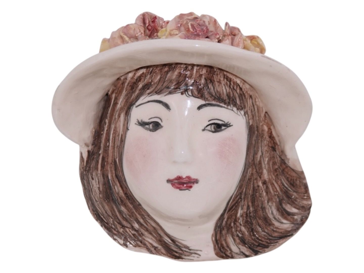 Beskrivelse: Doreen Middelboe keramik, væghængt figur af dame med blomsterhat.