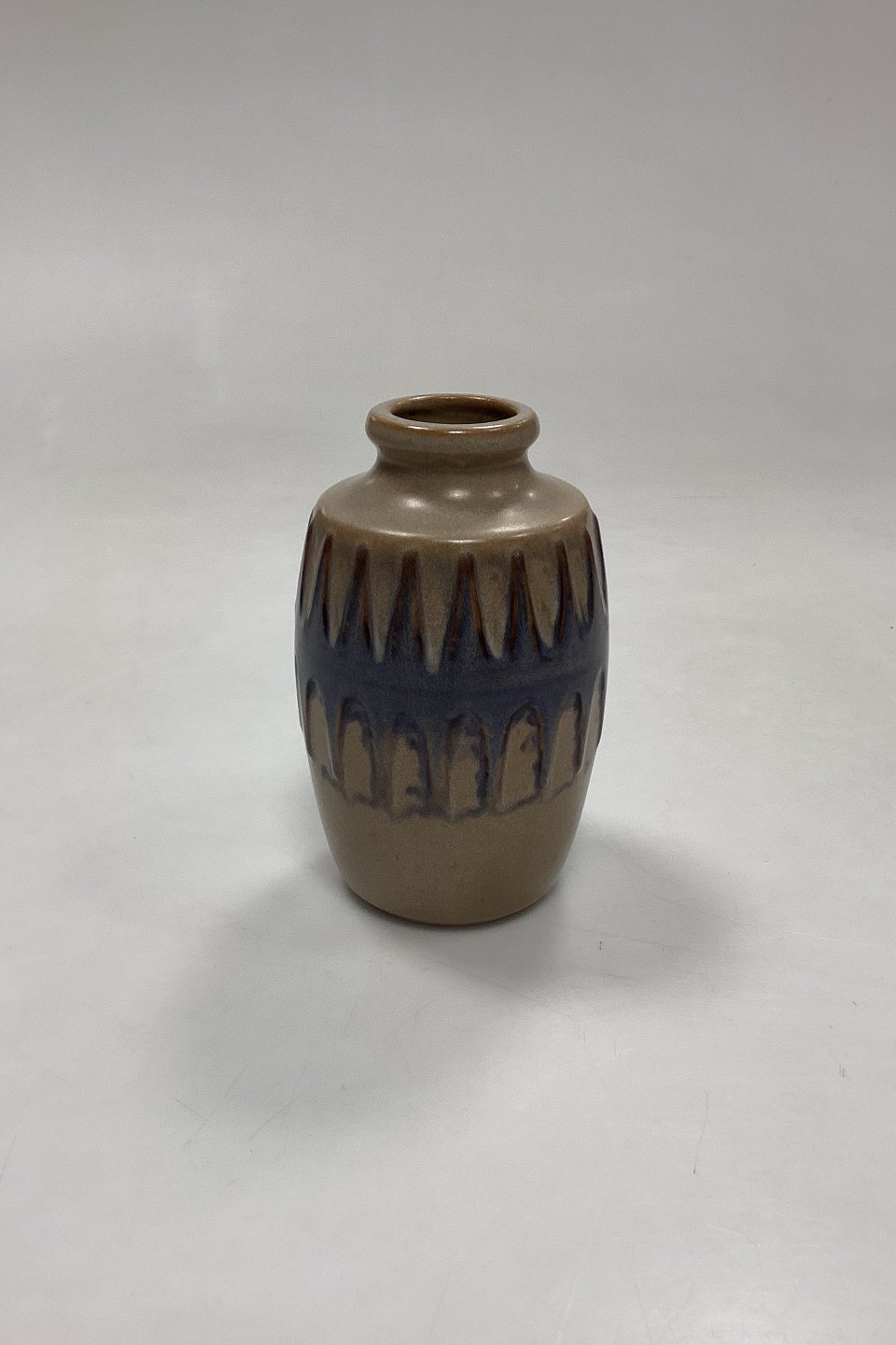 : L. Hjort Keramik Vase. Beige, brun og blå glasur med moderne grafisk dekoration.