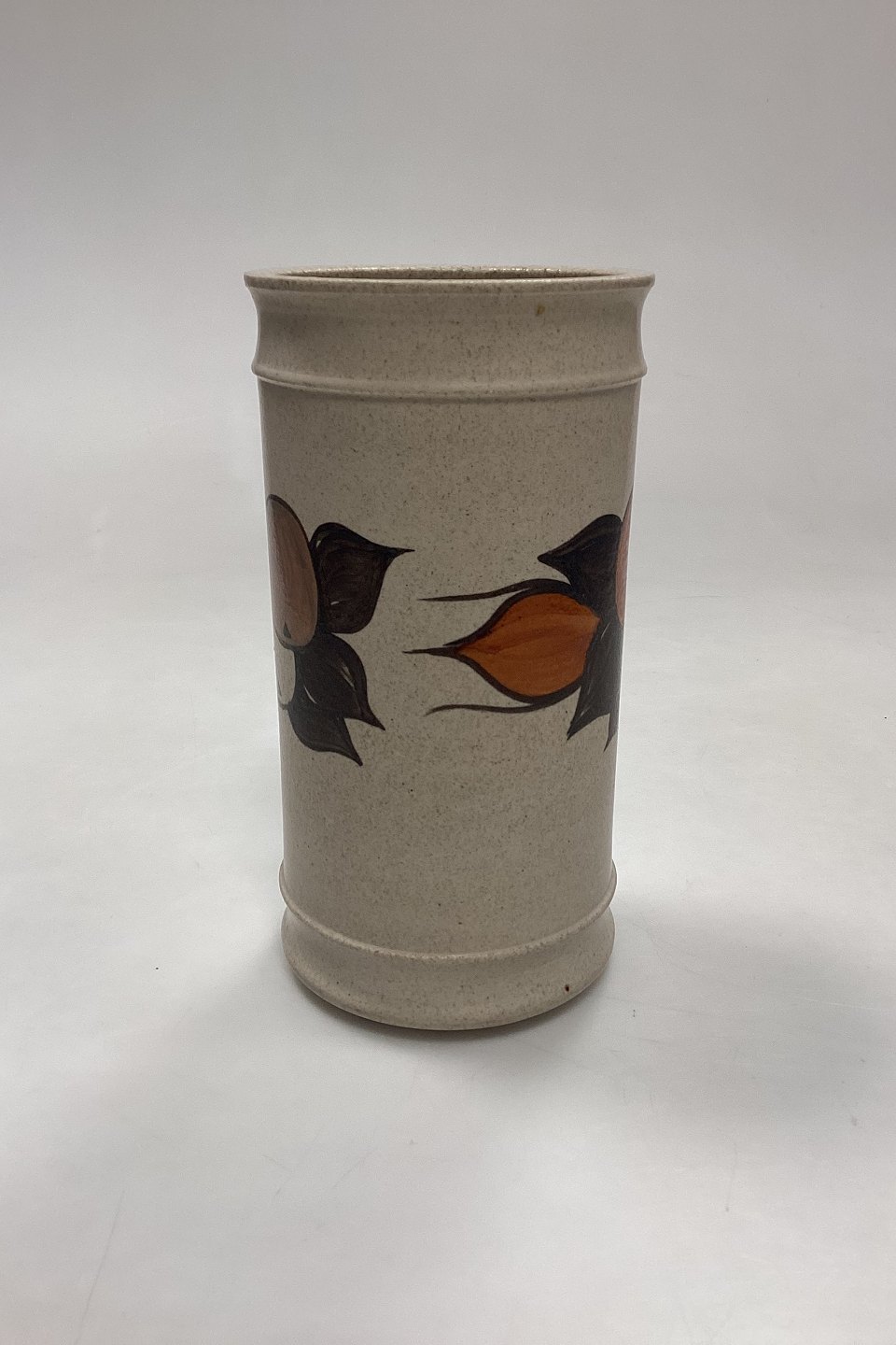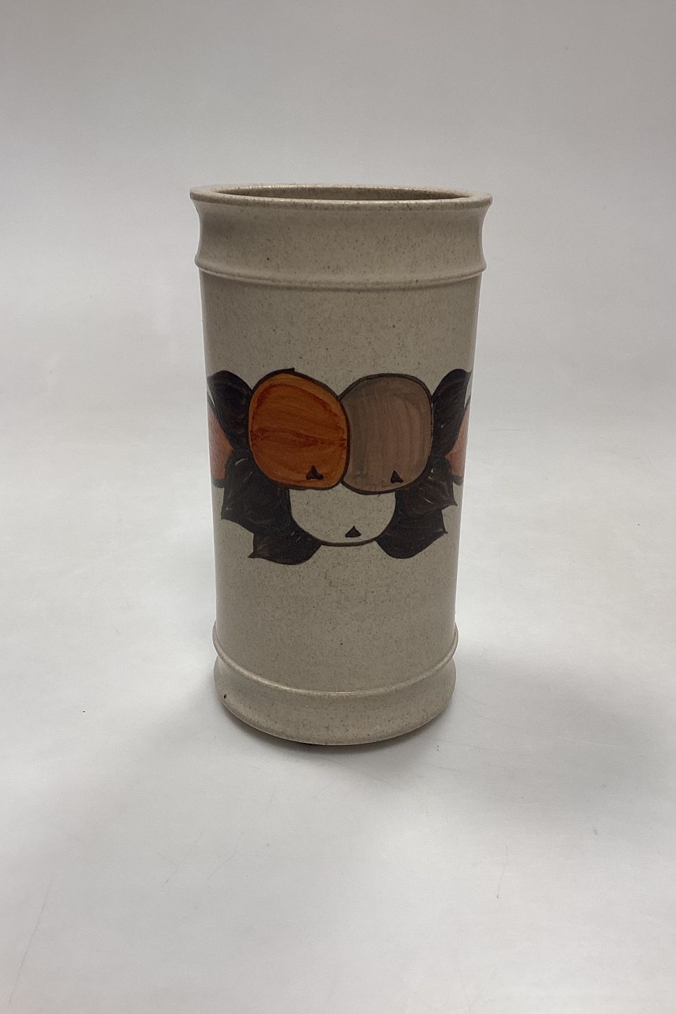 Beskrivelse: Kähler Keramik Vase med Æbler No. 811-18. Motiv i orange og brun på baggrund af råhvidt stentøj.
