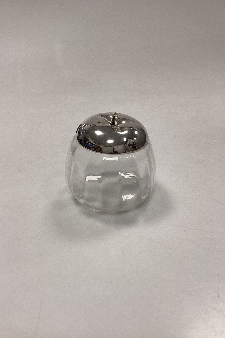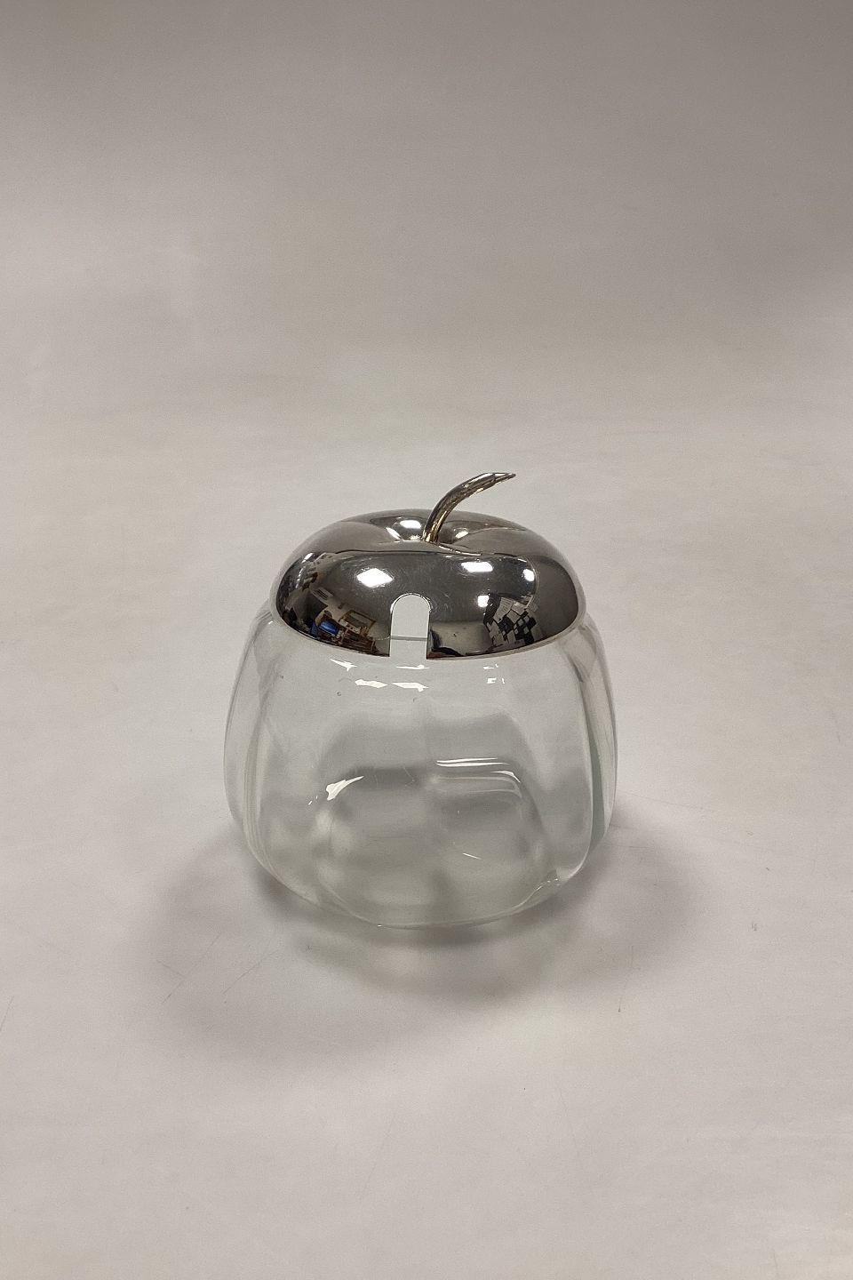 Beskrivelse: Engelsk Sølvplet/EPNS Marmeladekrukke. Glasset har optiske riller, og låget er formet som toppen af et æble.