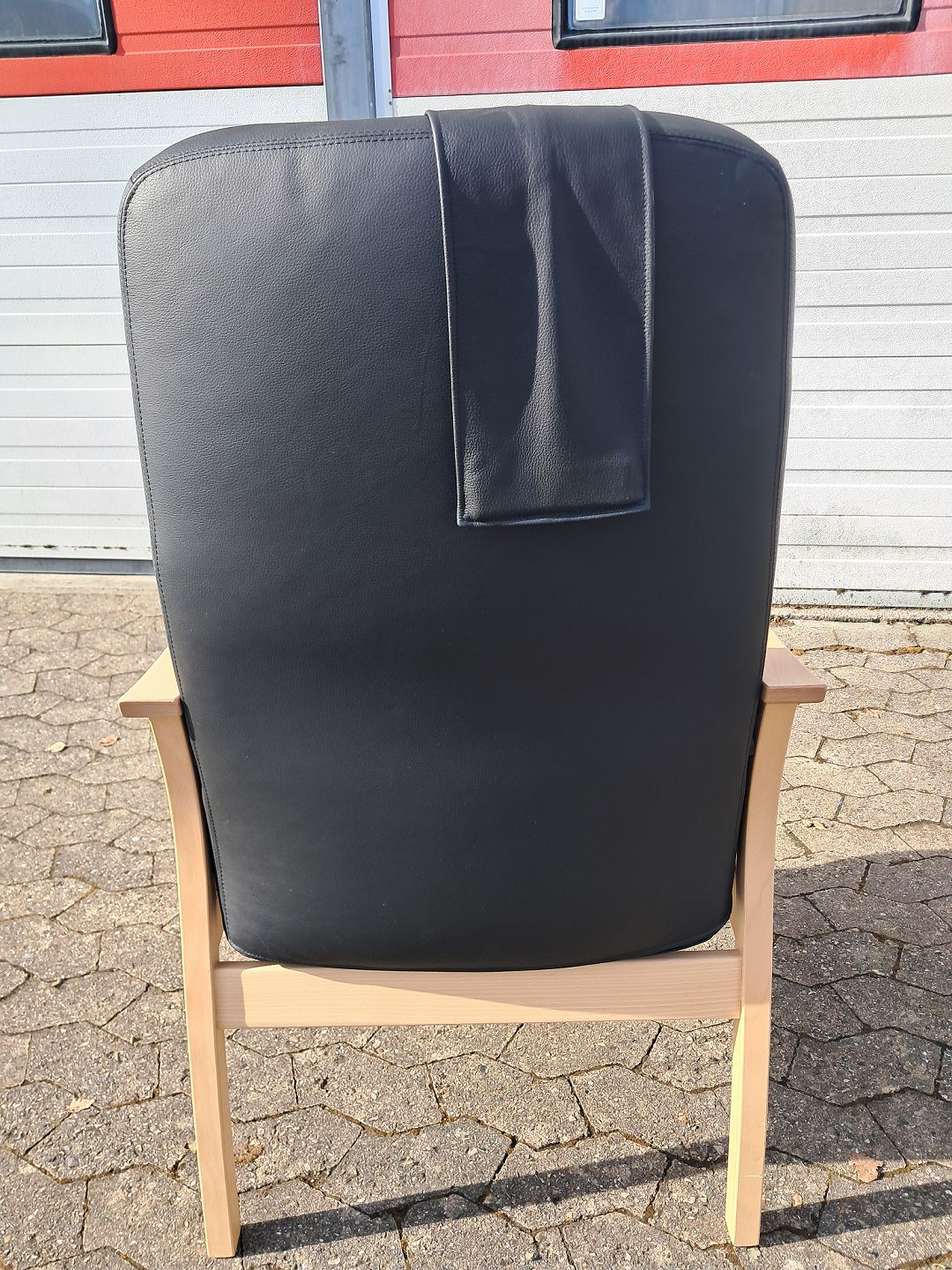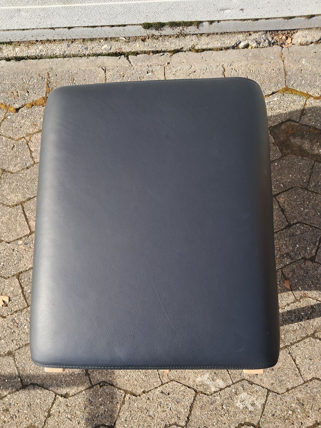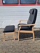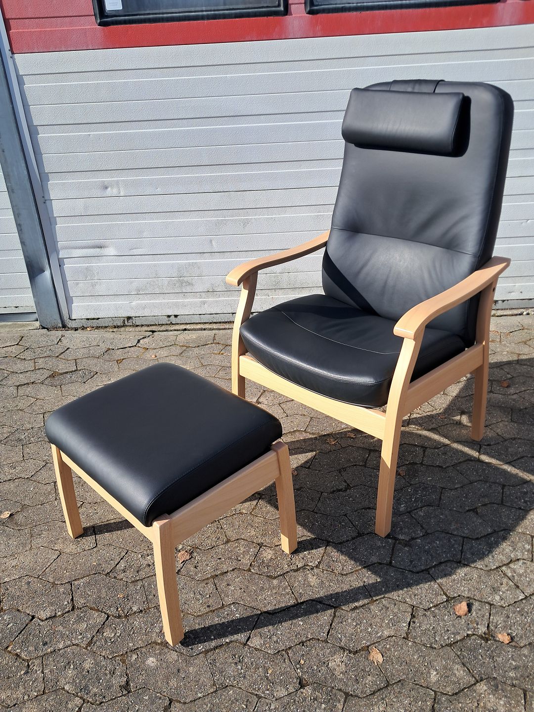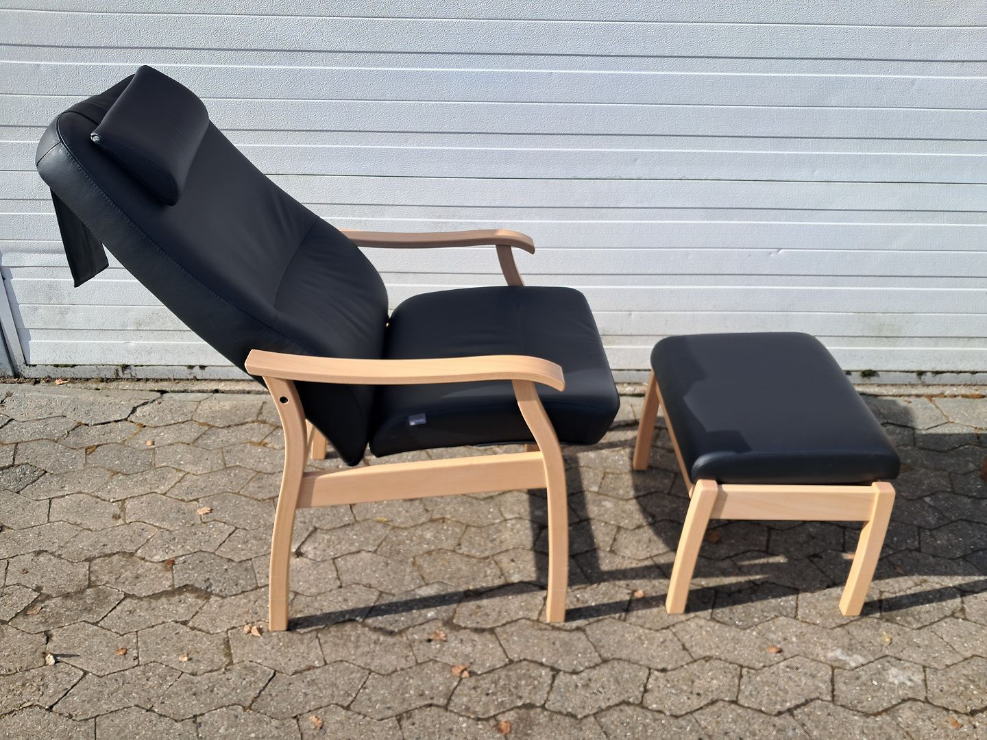 Beskrivelse: Farstrup lænestol og skammel i bøgetræ med læderbetræk, fra 2010erne.