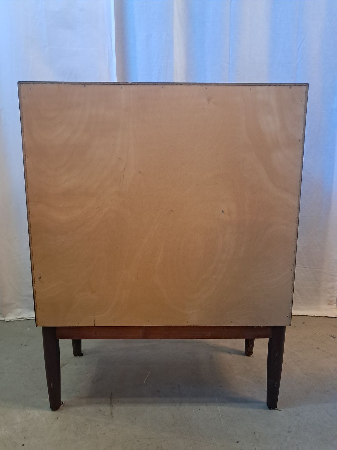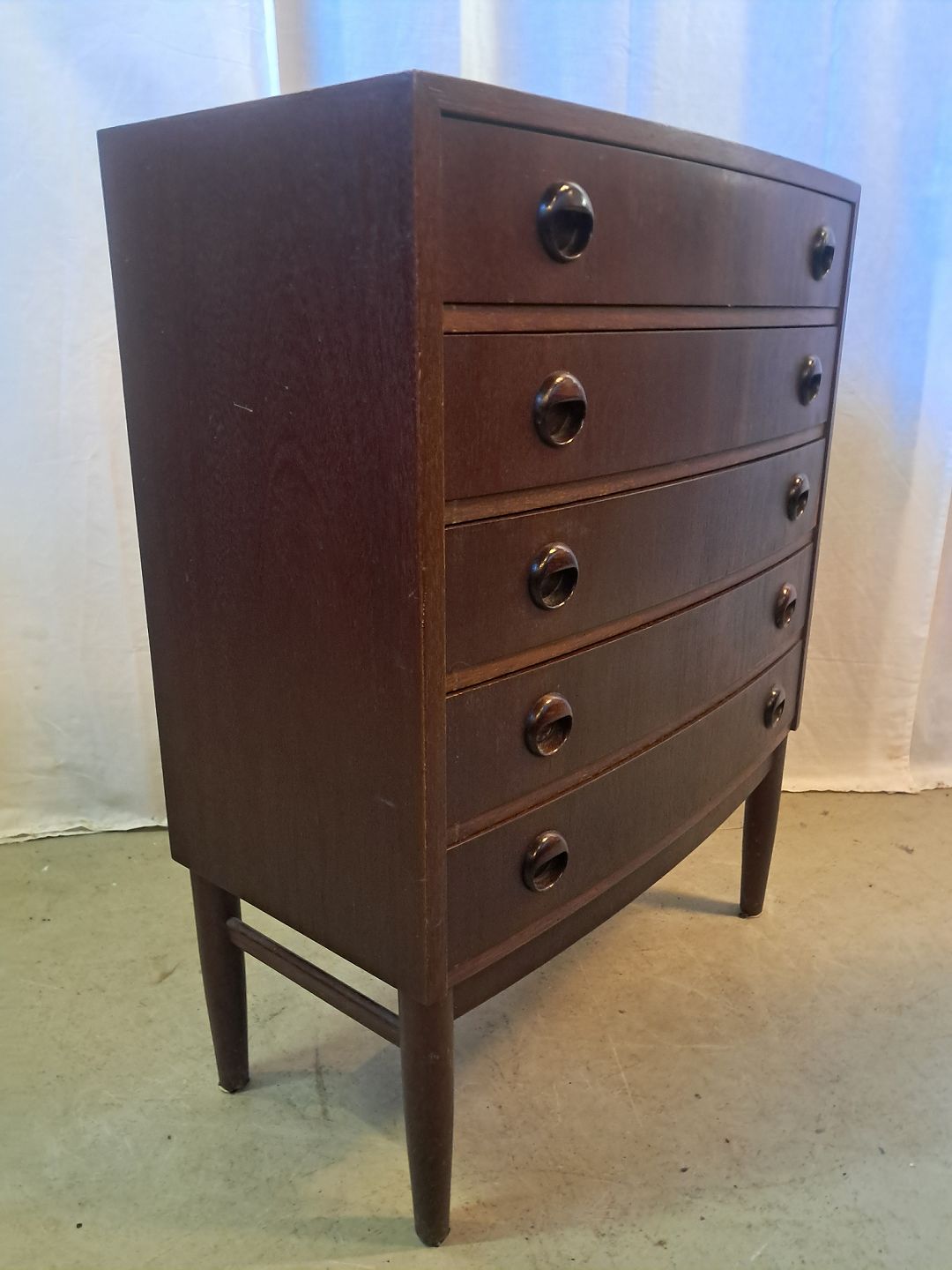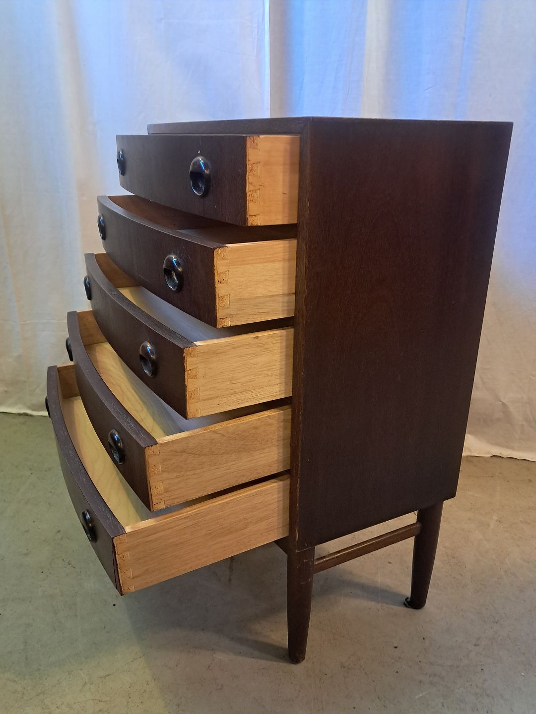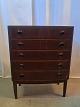 Beskrivelse: Kommode i bejdset fineret rgrtræ, fra 1960erne.