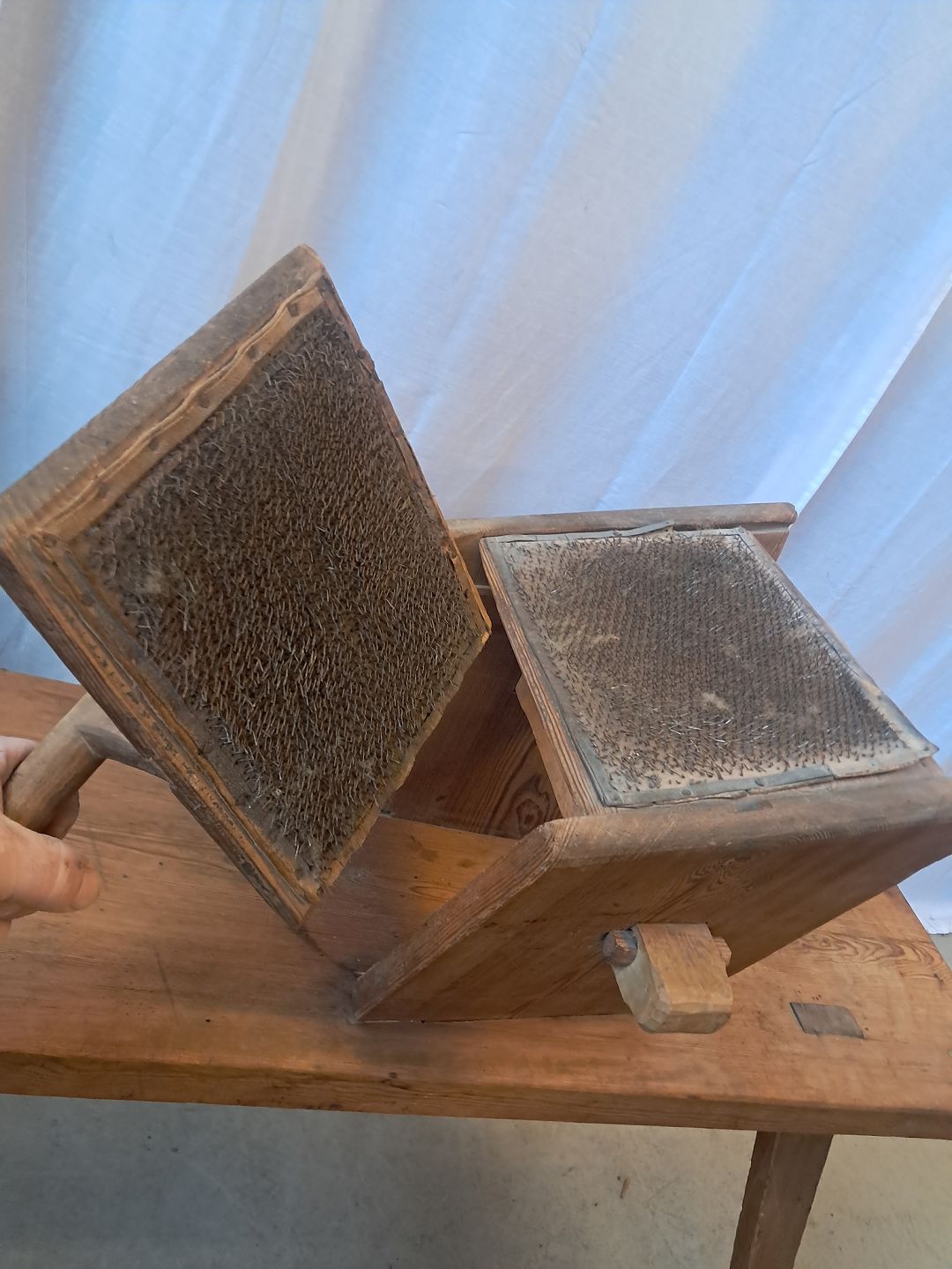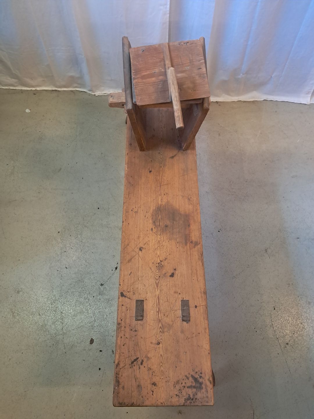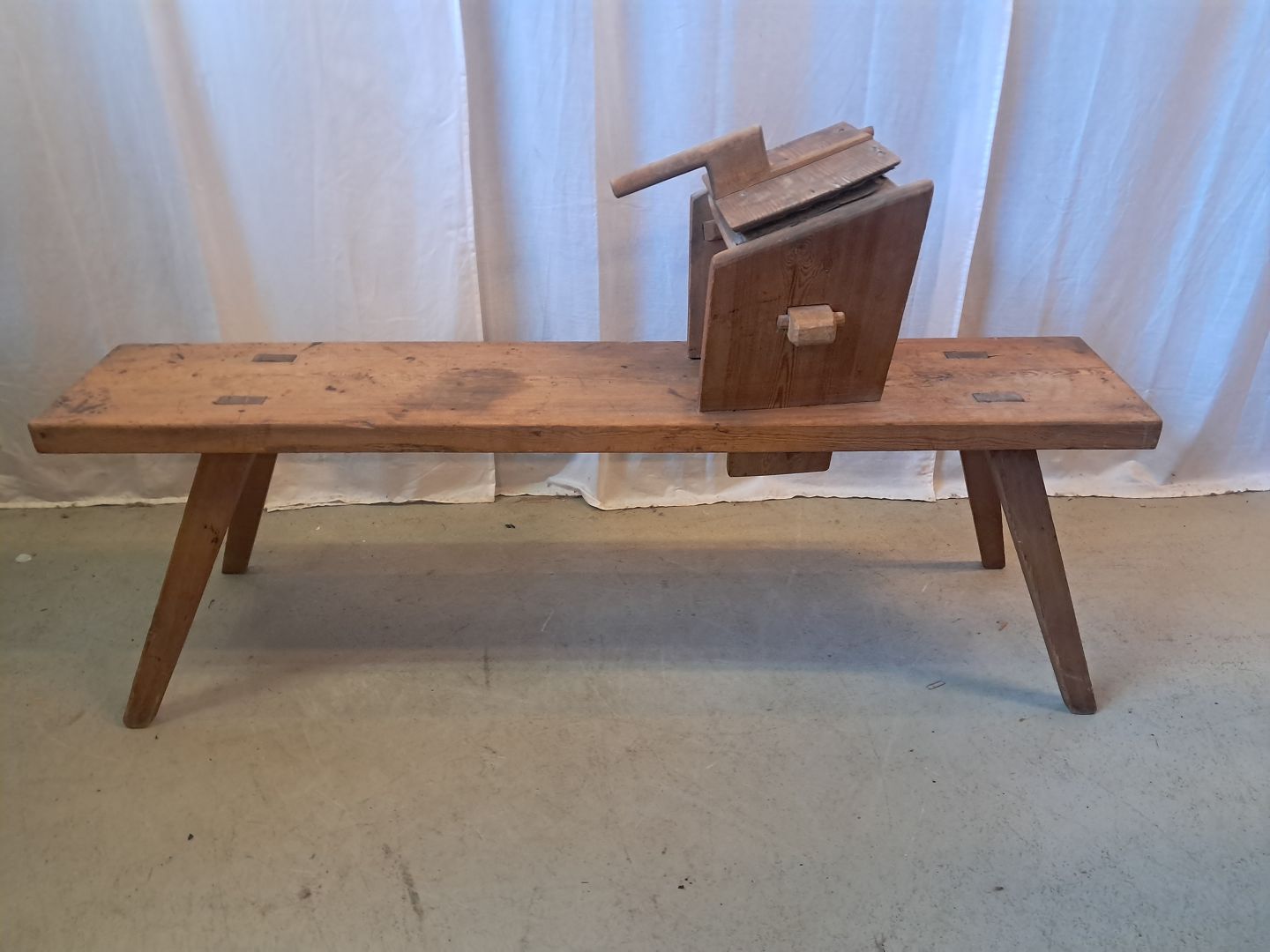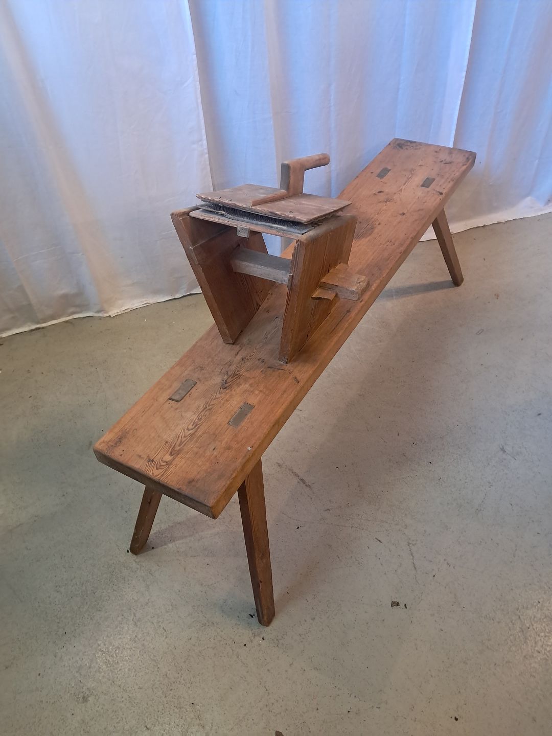 Beskrivelse: Bænk til uldkarding i massivt fyrretræ, fra 1910erne.