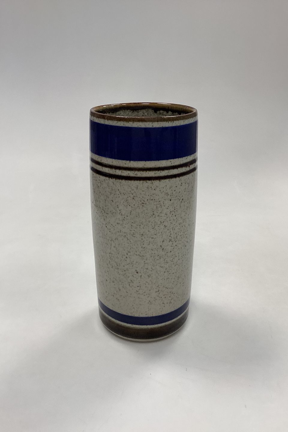 Beskrivelse: Michael Andersen Keramik Stentøjsvase. Beigemeleret med brune og mørkeblå striber.