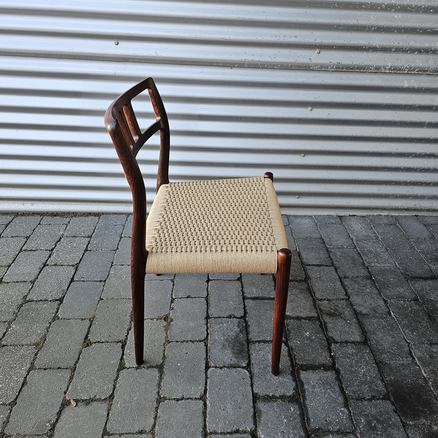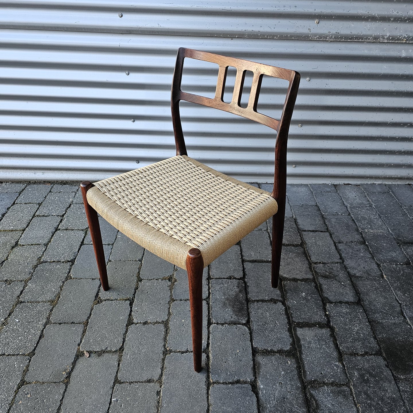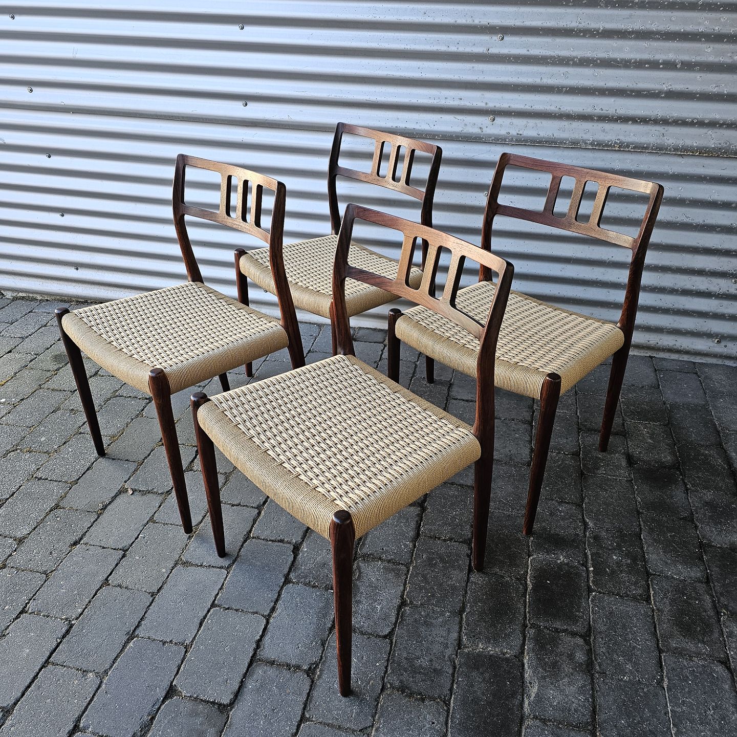 Beskrivelse: Sæt med fire styk spisebordsstole model 79 i palisander med ny flettede sæder