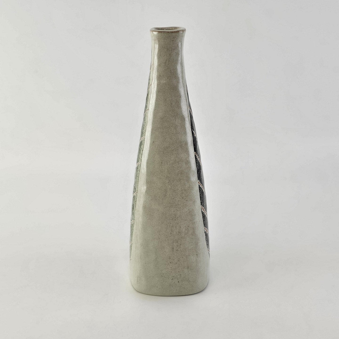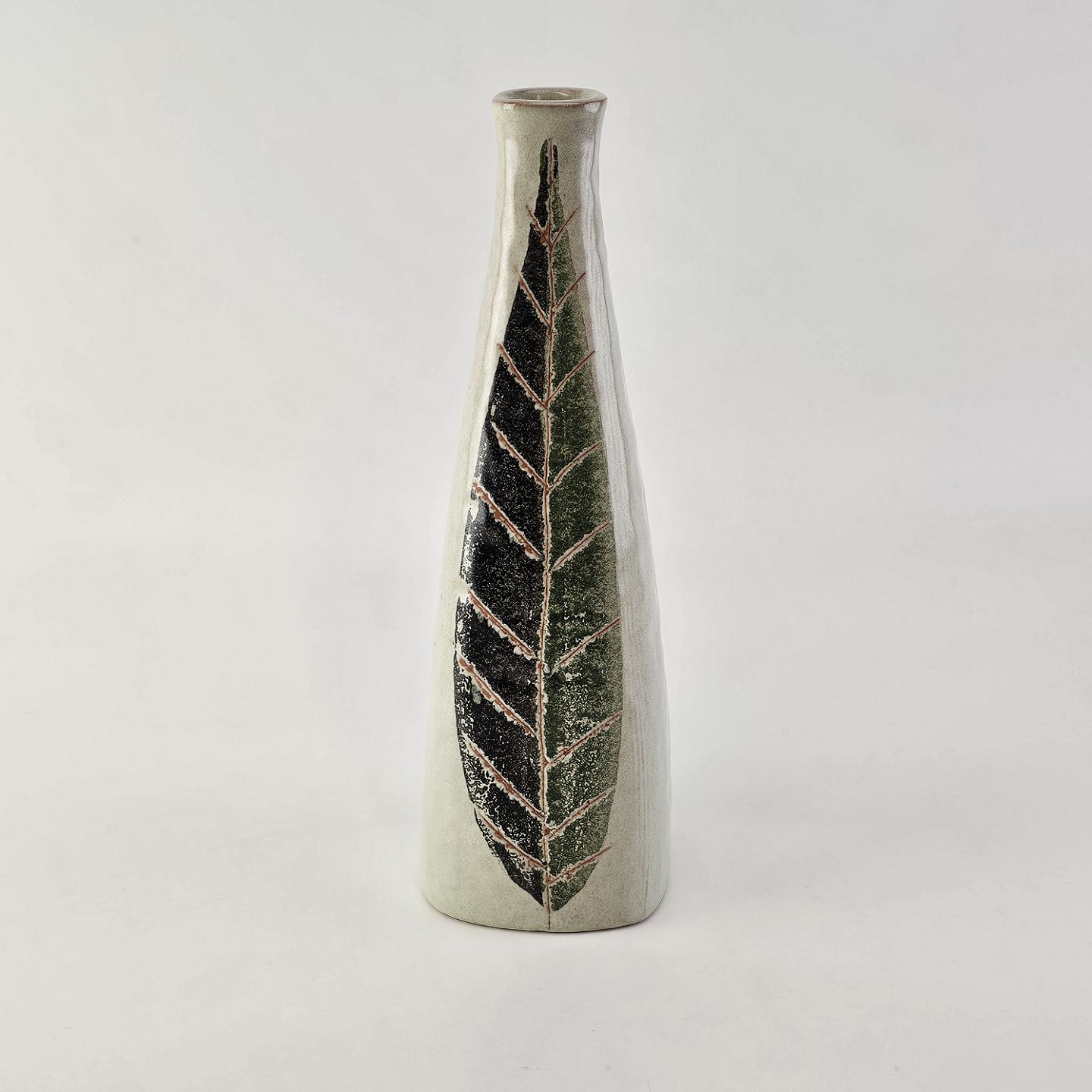 Beskrivelse: Firkantet vase i keramik med bladmotiv