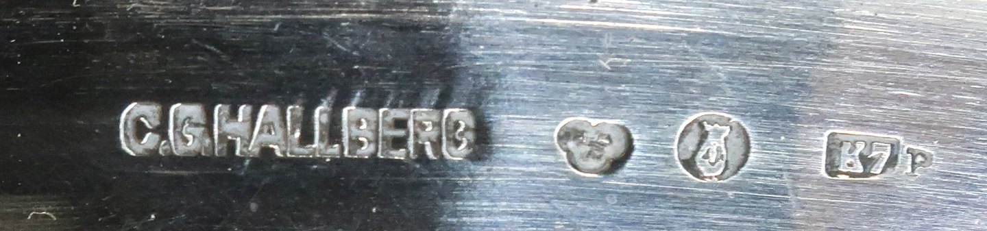 Beskrivelse: C.G.Hallberg, Sverige. Stor jardinere af sølv med glasinsats (830). Længde 46 cm. Produceret 1912 (K7). Der er 2 afslag på glas (se foto).